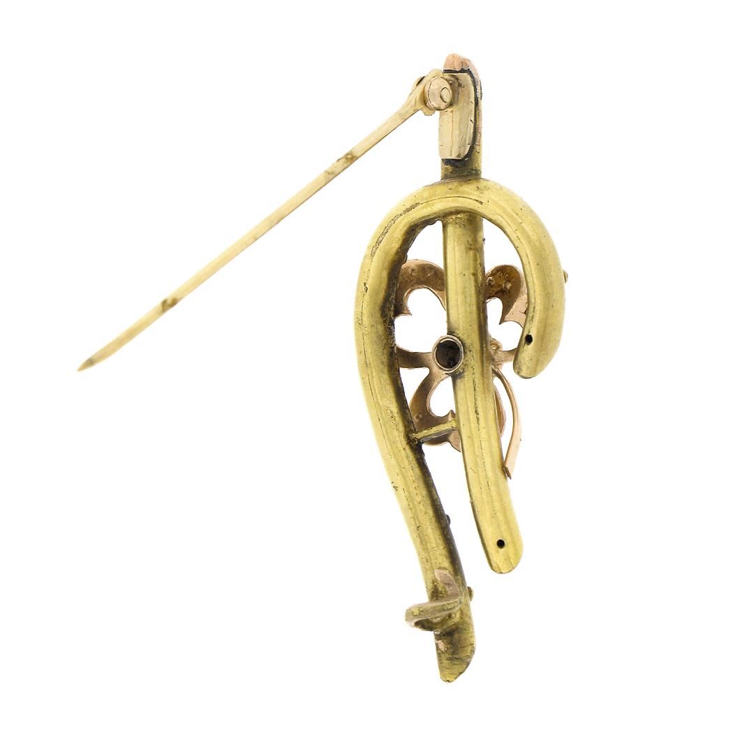 An antique solid 14k yellow and white gold brooch, with 12 round shape cultured seed pearls (1.4mm each), and 1 old mine cushion cut natural sapphire (0.08ctw ). Measures 17.60x45.30mm and weighs a total of 3.27 grams.
