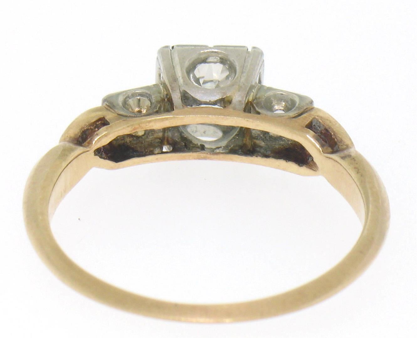 An antique victorian solid 14k white and yellow gold 3 stones ring, featuring 3 cushion old cut natural diamonds (H/I - VS2; 0.40ctw). The ring is size 5.5, weighs a total of 2.3 grams, and measures 5.88mm wide.