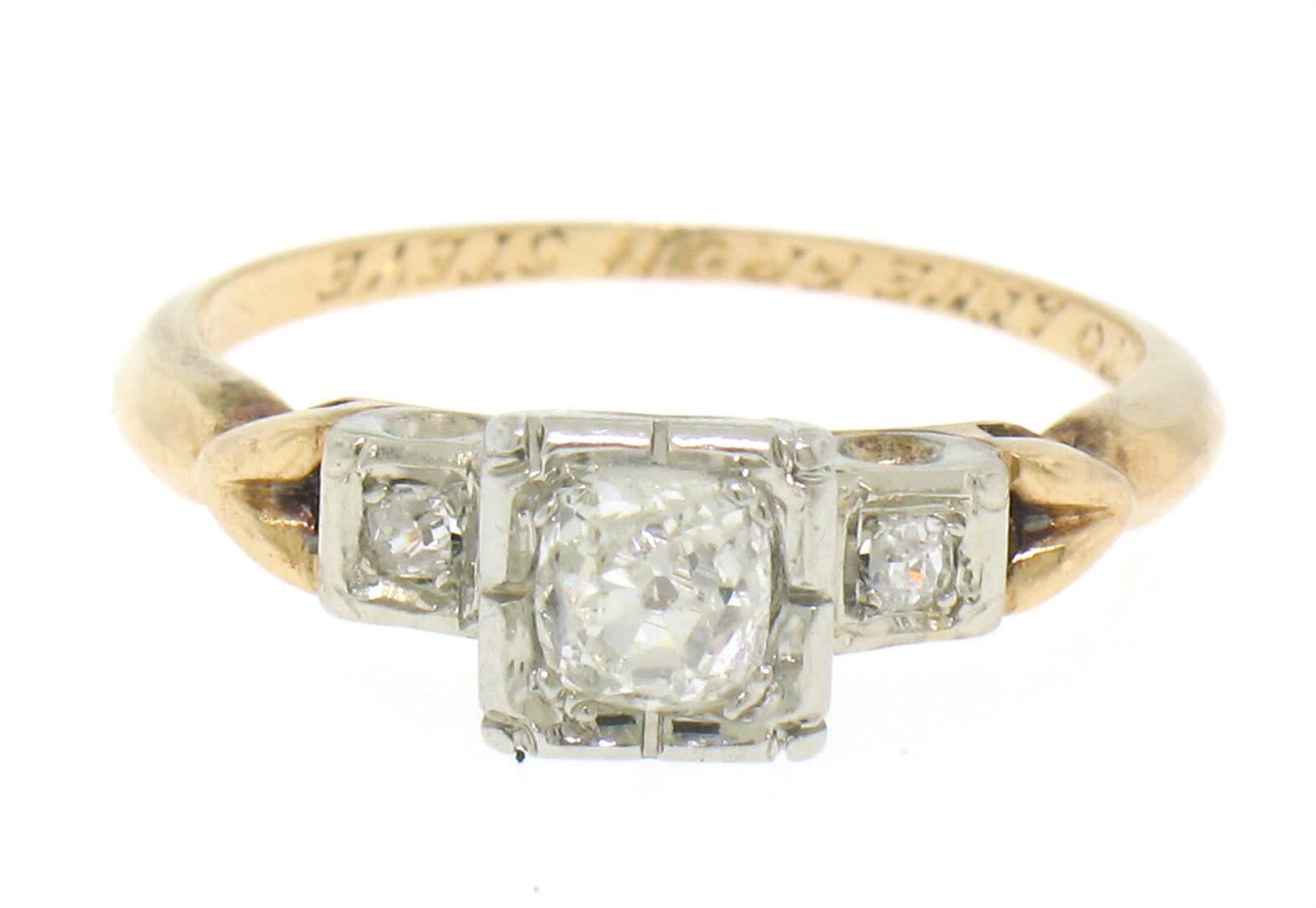 An antique victorian solid 14k white and yellow gold 3 stones ring, featuring 3 cushion old cut natural diamonds (H/I - VS2; 0.40ctw). The ring is size 5.5, weighs a total of 2.3 grams, and measures 5.88mm wide.