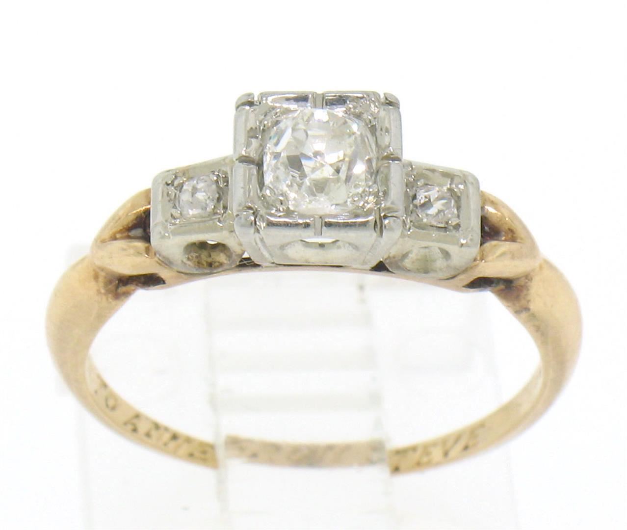 An antique victorian solid 14k white and yellow gold 3 stones ring, featuring 3 cushion old cut natural diamonds (H/I - VS2; 0.40ctw). The ring is size 5.5, weighs a total of 2.3 grams, and measures 5.88mm wide.