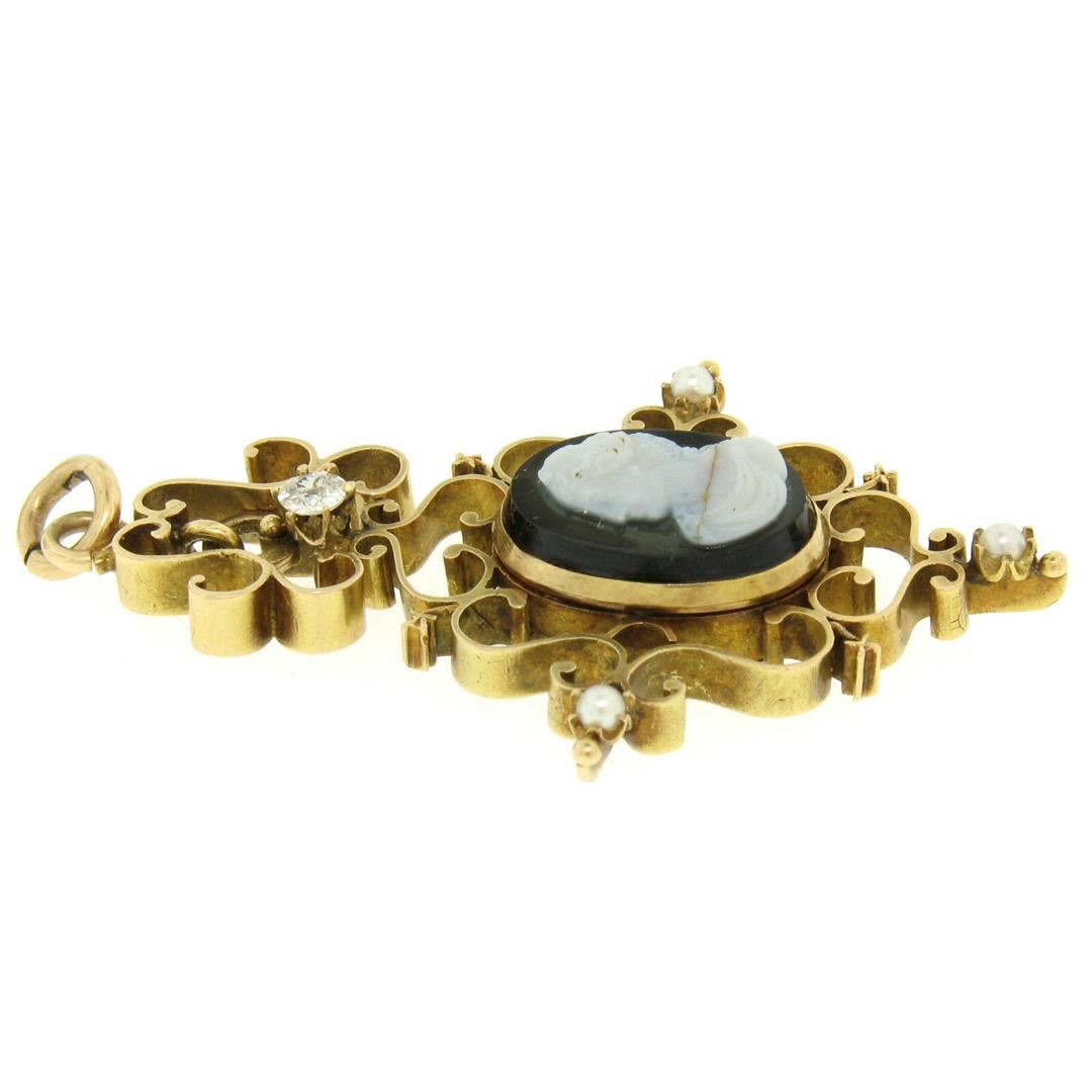 An excellent condition antique 14k yellow gold locket pendant with a oval carved white and black stone cameo, 2.6mm seed pearls, and a 0.20ct old mine cut diamond (I - VS2). The pendant weighs a total of 16.2 grams and measures 65.2x37.5mm.