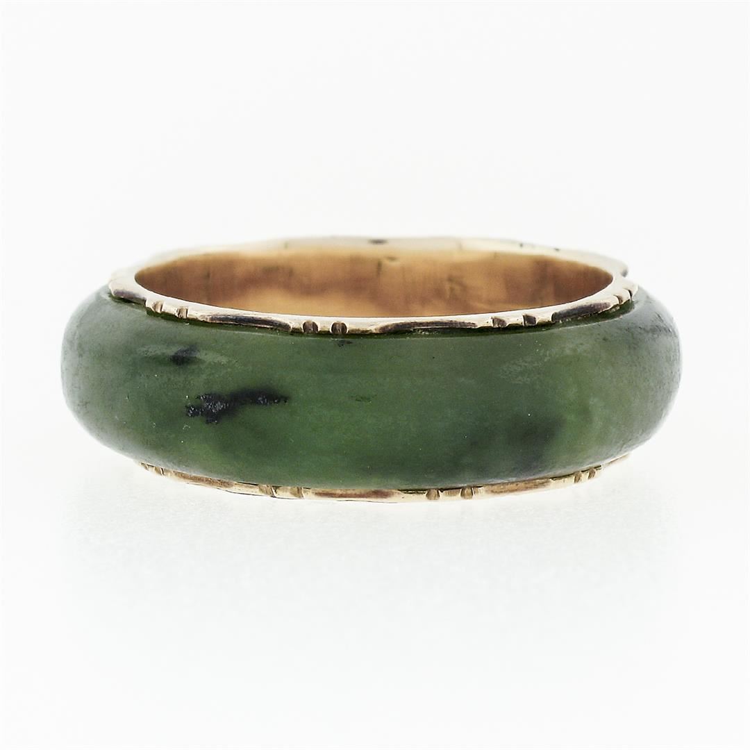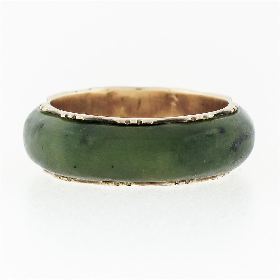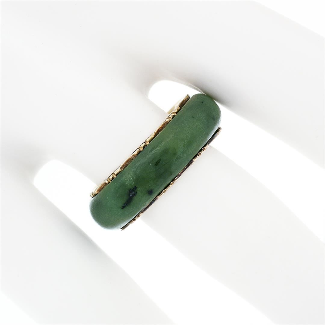 A Victorian solid 14k yellow gold band ring, with ring cut natural jade (23.22x5.45mm). The ring is size 7.0, weighs a total of 3.53 grams, and measures 6.78mm wide.