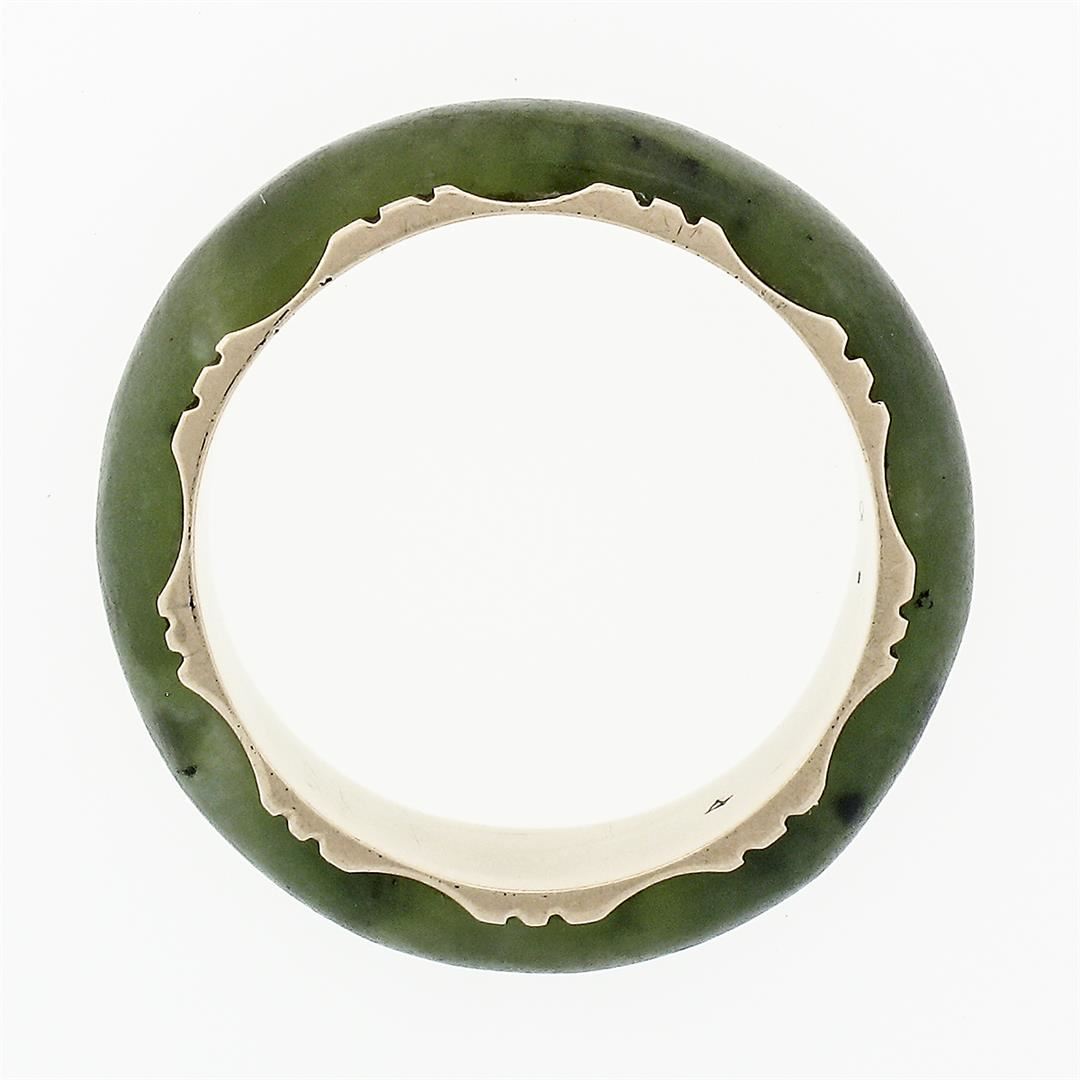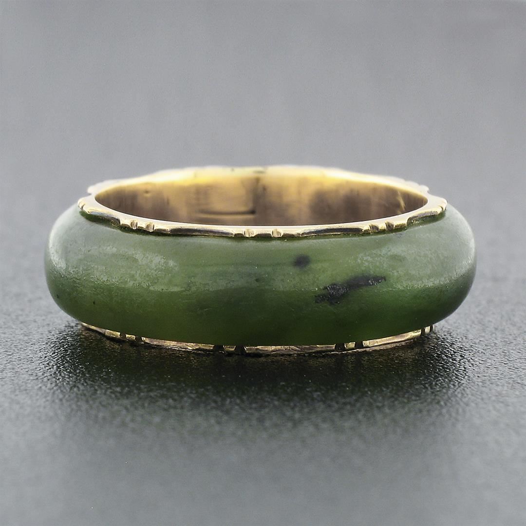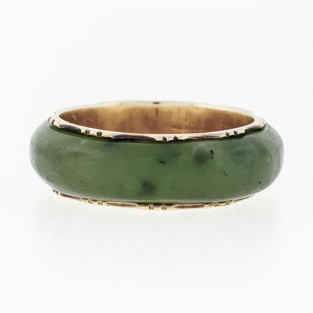A Victorian solid 14k yellow gold band ring, with ring cut natural jade (23.22x5.45mm). The ring is size 7.0, weighs a total of 3.53 grams, and measures 6.78mm wide.