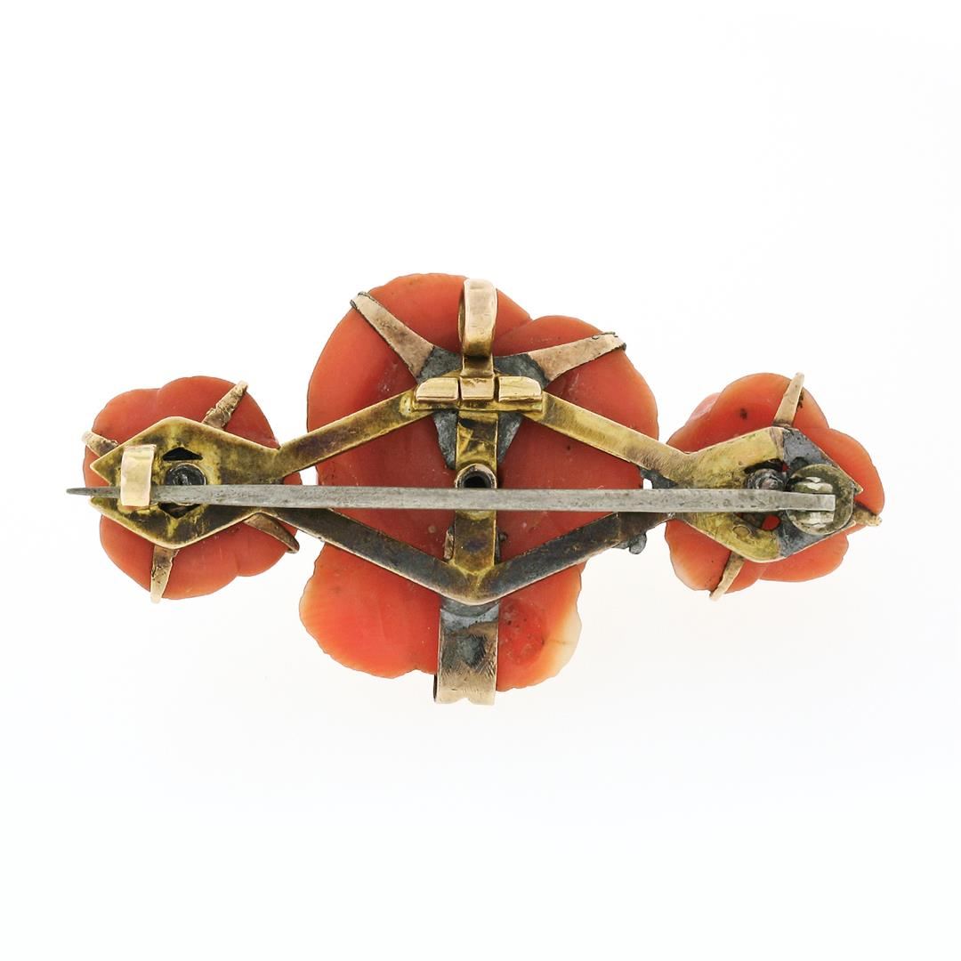 An antique victorian solid 14k yellow gold bar pin brooch pendant, featuring 3 carved roses natural corals, 1 was Gia certified (24.21 x 19.88 x 10.41 mm). Measures 24.31x44.88mm and weighs a total of 11.38 grams. Comes with all original relevant certifications.