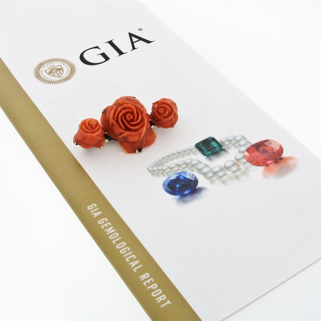 An antique victorian solid 14k yellow gold bar pin brooch pendant, featuring 3 carved roses natural corals, 1 was Gia certified (24.21 x 19.88 x 10.41 mm). Measures 24.31x44.88mm and weighs a total of 11.38 grams. Comes with all original relevant certifications.
