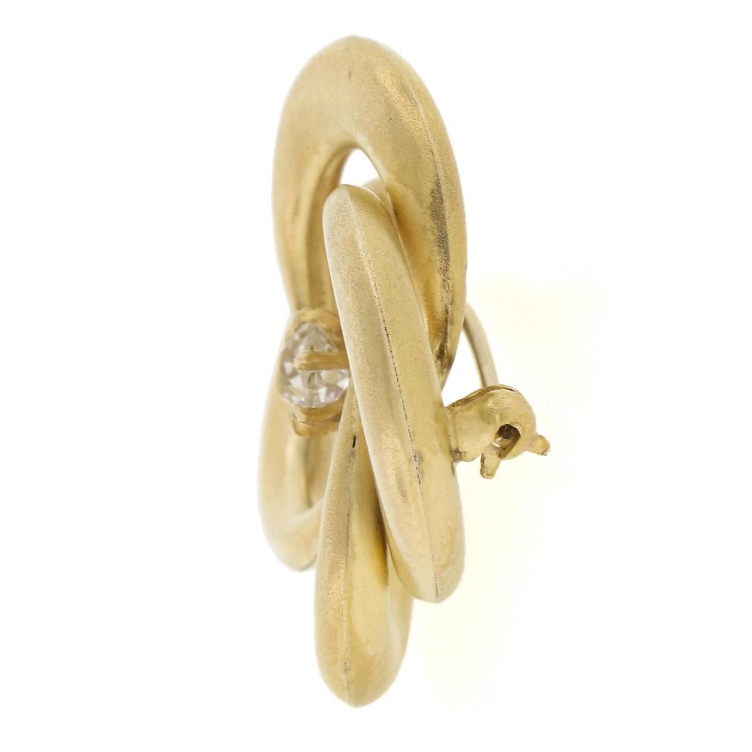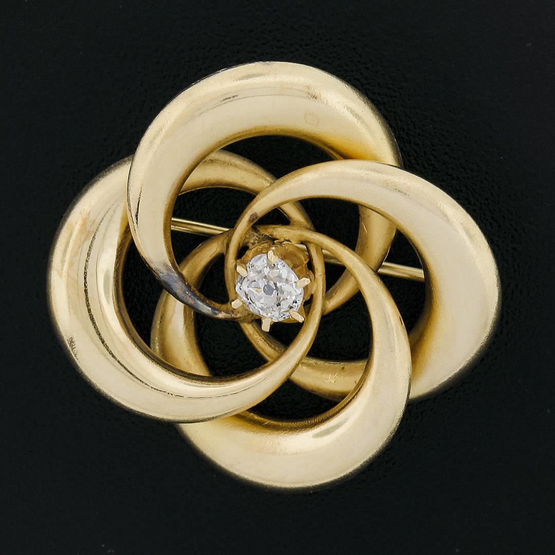 An antique solid 14k yellow gold knot brooch, with 1 old mine cut natural diamond (H - I1 ; 0.27ct ). Measures 25.9x26.2mm and weighs a total of 4.79 grams.
