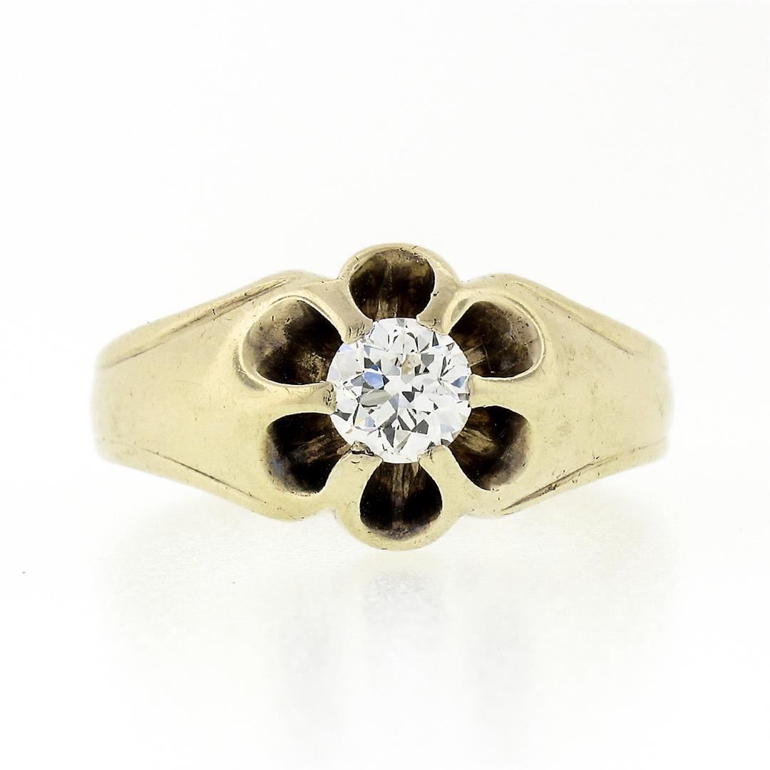 An antique victorian solid 14k yellow gold belcher flower band ring, with 1 old european cut naural diamond (VS2 ; H - 0.57ctw). The ring is size 10, weighs a total of 7.17 grams, and measures 11.3mm wide.