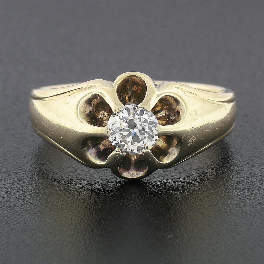 An antique victorian solid 14k yellow gold belcher flower band ring, with 1 old european cut naural diamond (VS2 ; H - 0.57ctw). The ring is size 10, weighs a total of 7.17 grams, and measures 11.3mm wide.