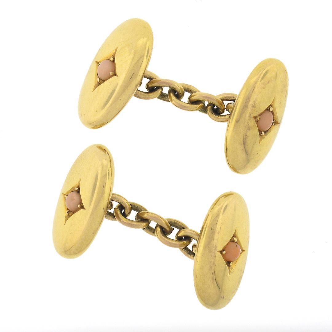 An antique solid 15k yellow gold cufflinks, with 4 round shape natural corals (2.3mm each). These cuff links have a chain link design with a clearance of 16.8mm, weigh a total of 6.90 grams, and the front panels measure 15.2x8.7mm.