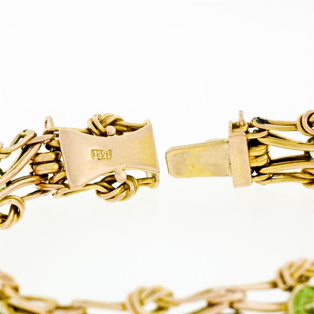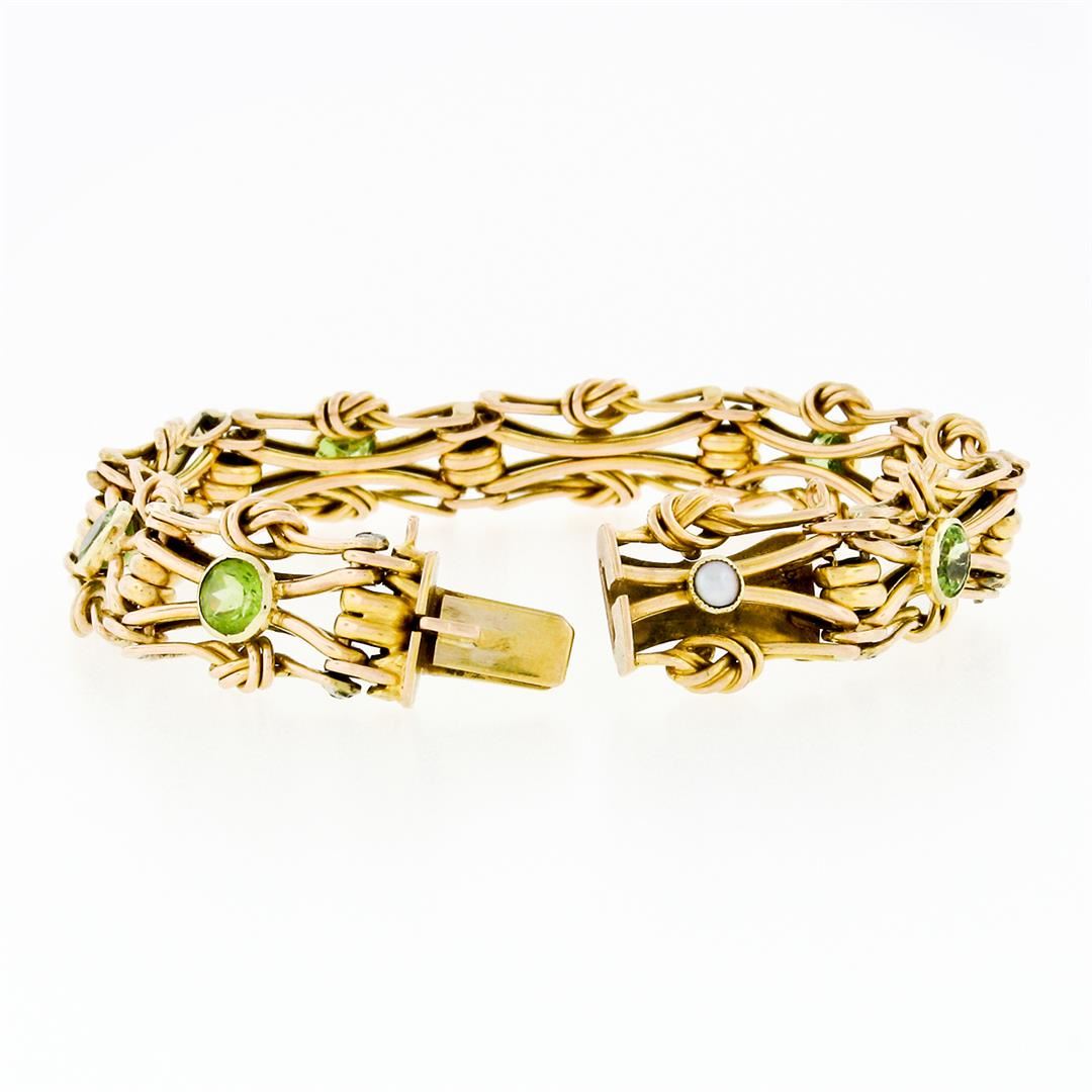 An antique victorian solid 15k yellow gold knot link bracelet, with 5 round cut natural peridots (2.5ctw ), & 4 round shape cultured pearls (3mm). It weighs a total of 15.58 grams, measures 11mm wide, and measures 6 inches in length.