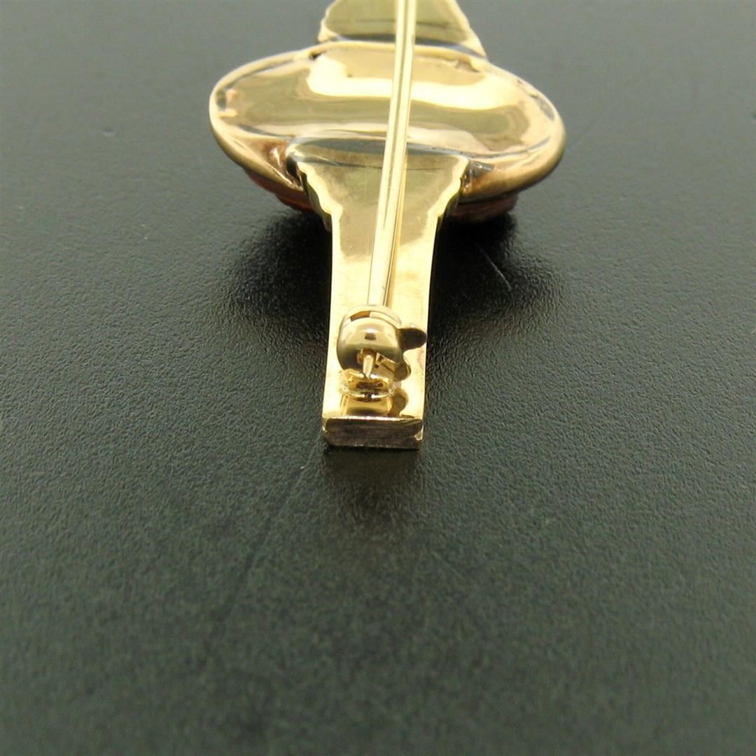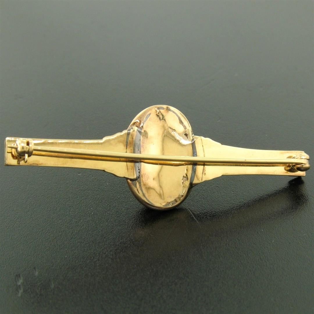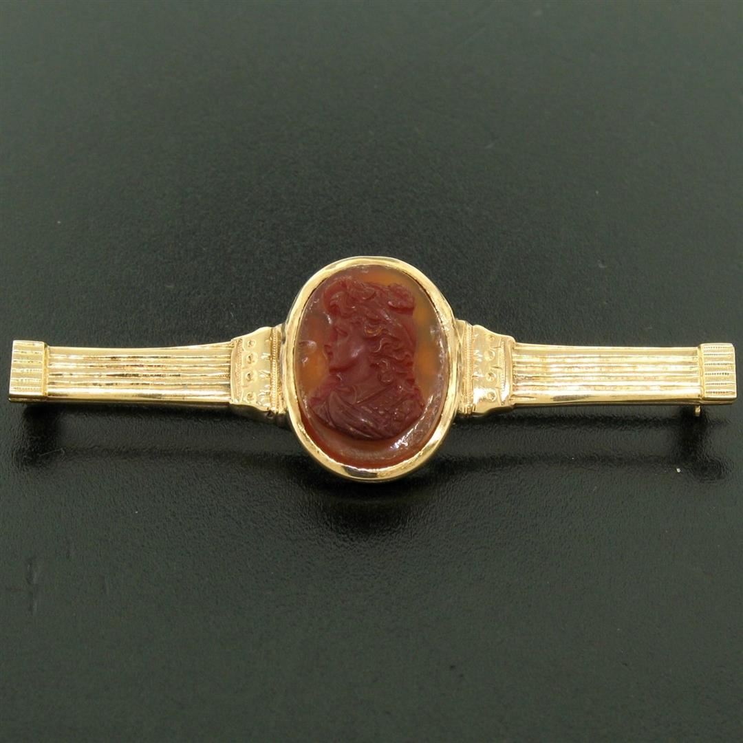 An antique victorian solid 15k rosy yellow gold pin brooch, faeturing 1 oval shape carved natural carnelian (20x14mm). Measures 20.1x59.95mm and weighs a total of 9.4 grams.