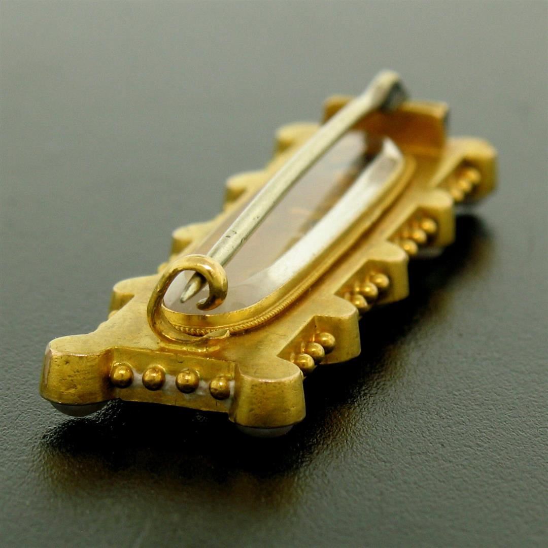 An antique solid 15k yellow gold bar pin brooch, featuring 49 round shape natural seed pearls (1.7-3.2mm), 3 old mine cut natural diamonds (F/G- VS1/VS2 ; 0.24ctw),and 4 rectangular shape natural black onyx (7.05x4.84mm). Measures 13.37x44.43mm and weighs a total of 8.35 grams.