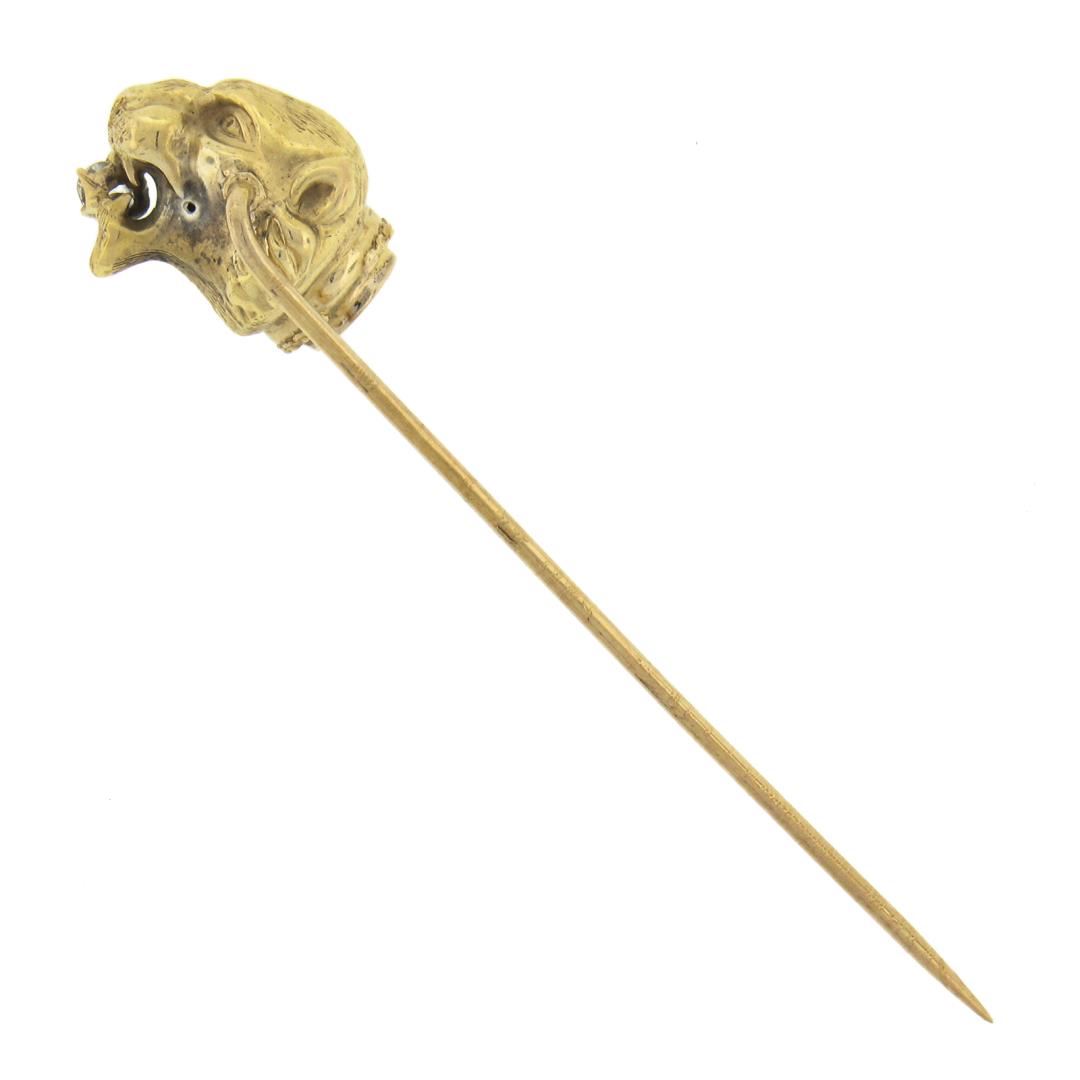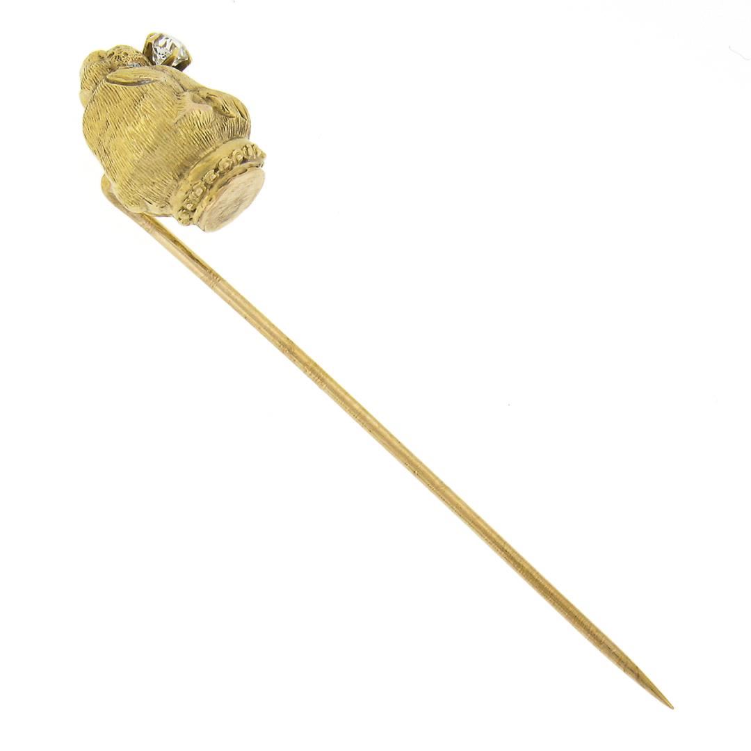 An antique solid 18k & 14k yellow gold stick pin, with 1 old cushion & 1 old mine cut natural diamonds (G-I - VS1-I1 ; 0.26ctw). Measures 67.35x16.70mm and weighs a total of 3.36 grams.
