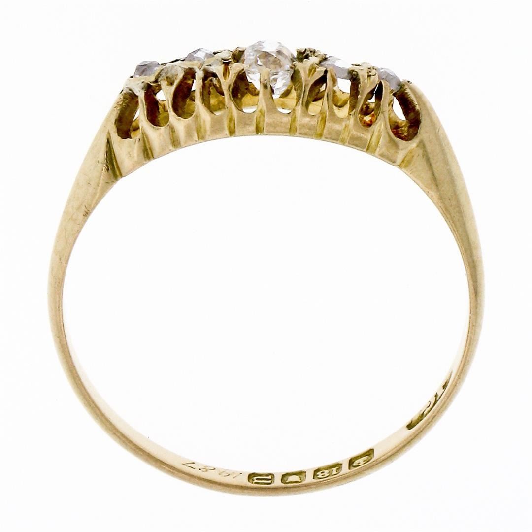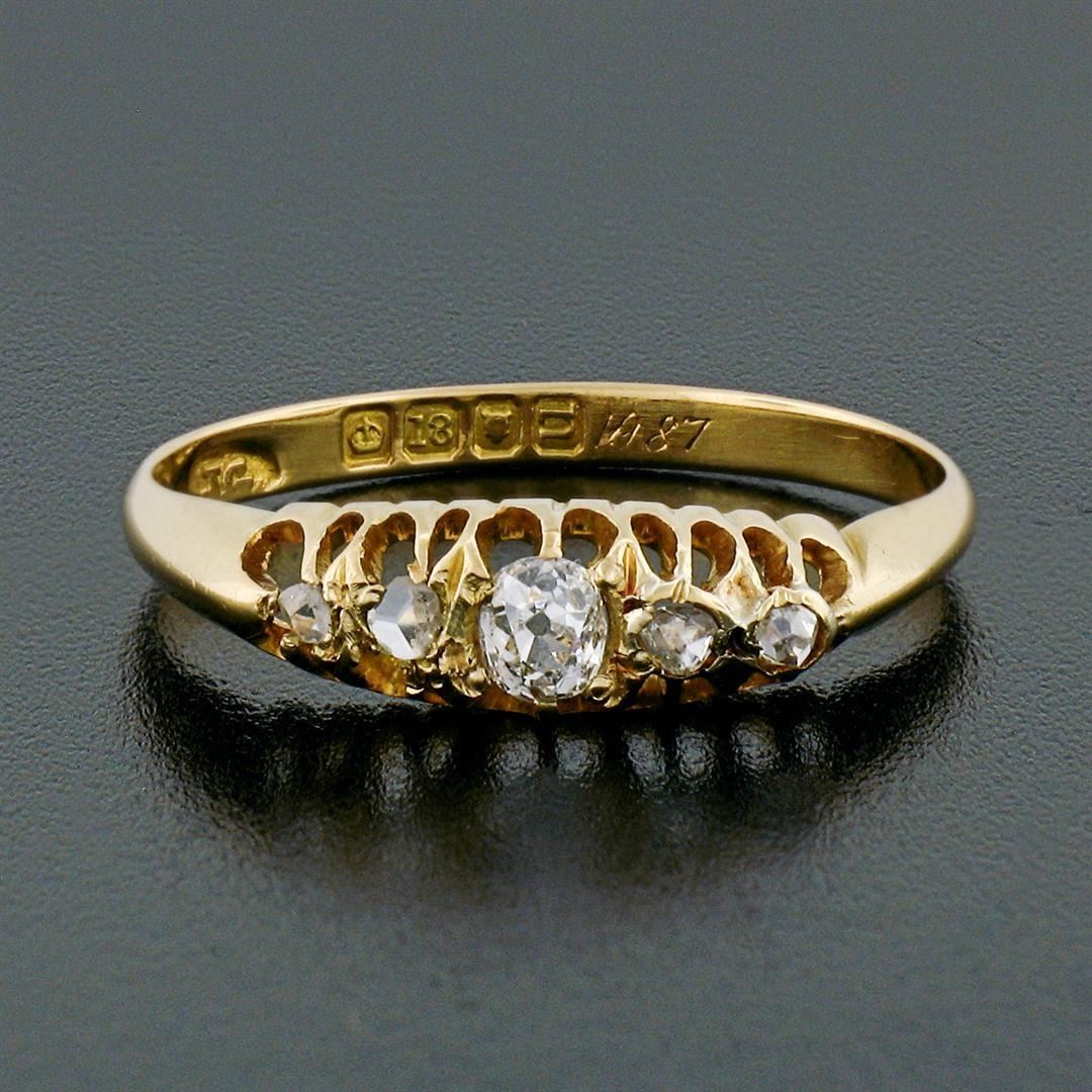 An antique solid 18k yellow gold band ring, 1 cushion old mine cut natural diamond (G - VS1; 0.20ct), and 4 rose cut natural diamonds (G/H- VS2/SI1 ; 0.12ctw ). The ring is size 8.0, weighs a total of 2.15 grams, and measures 5.0mm wide.
