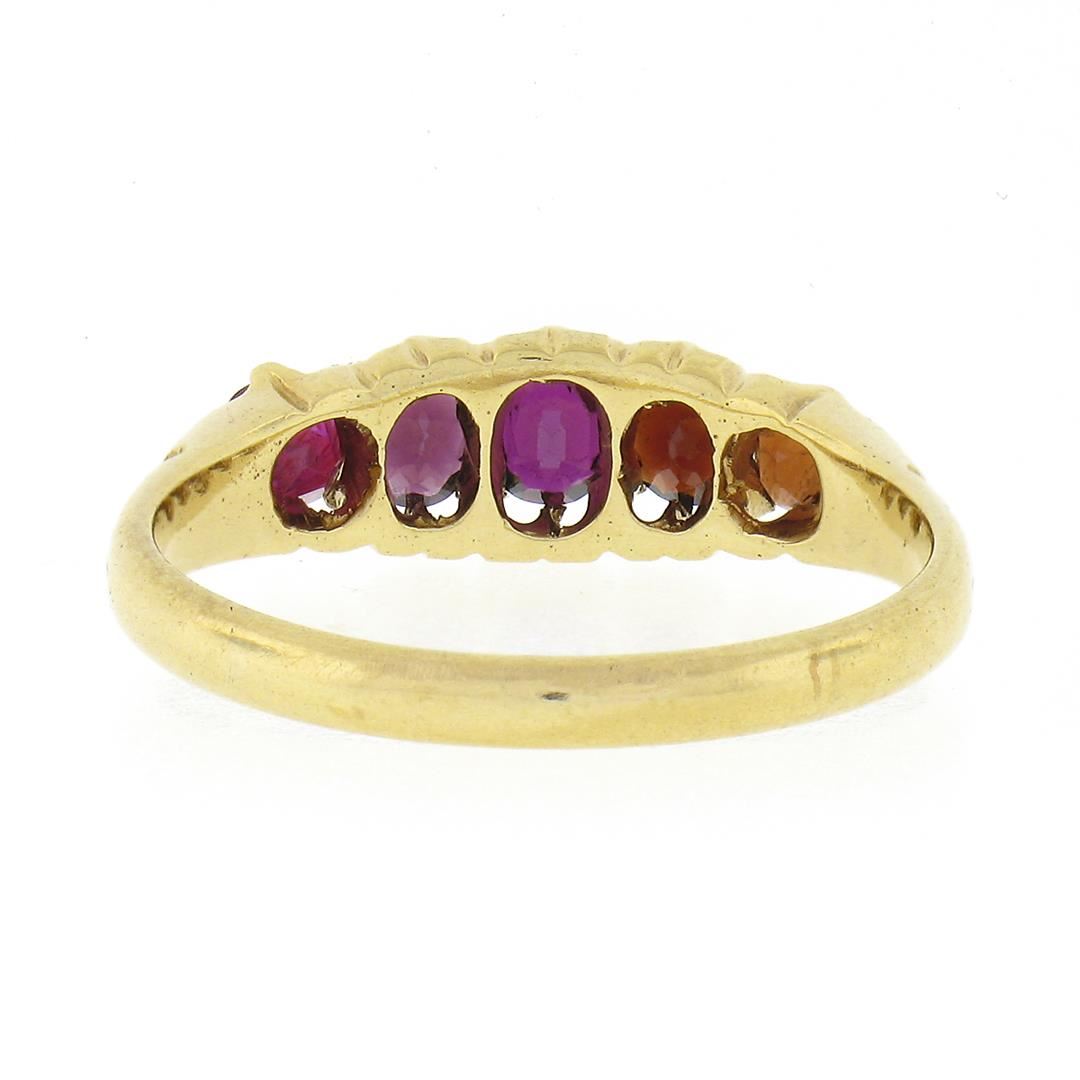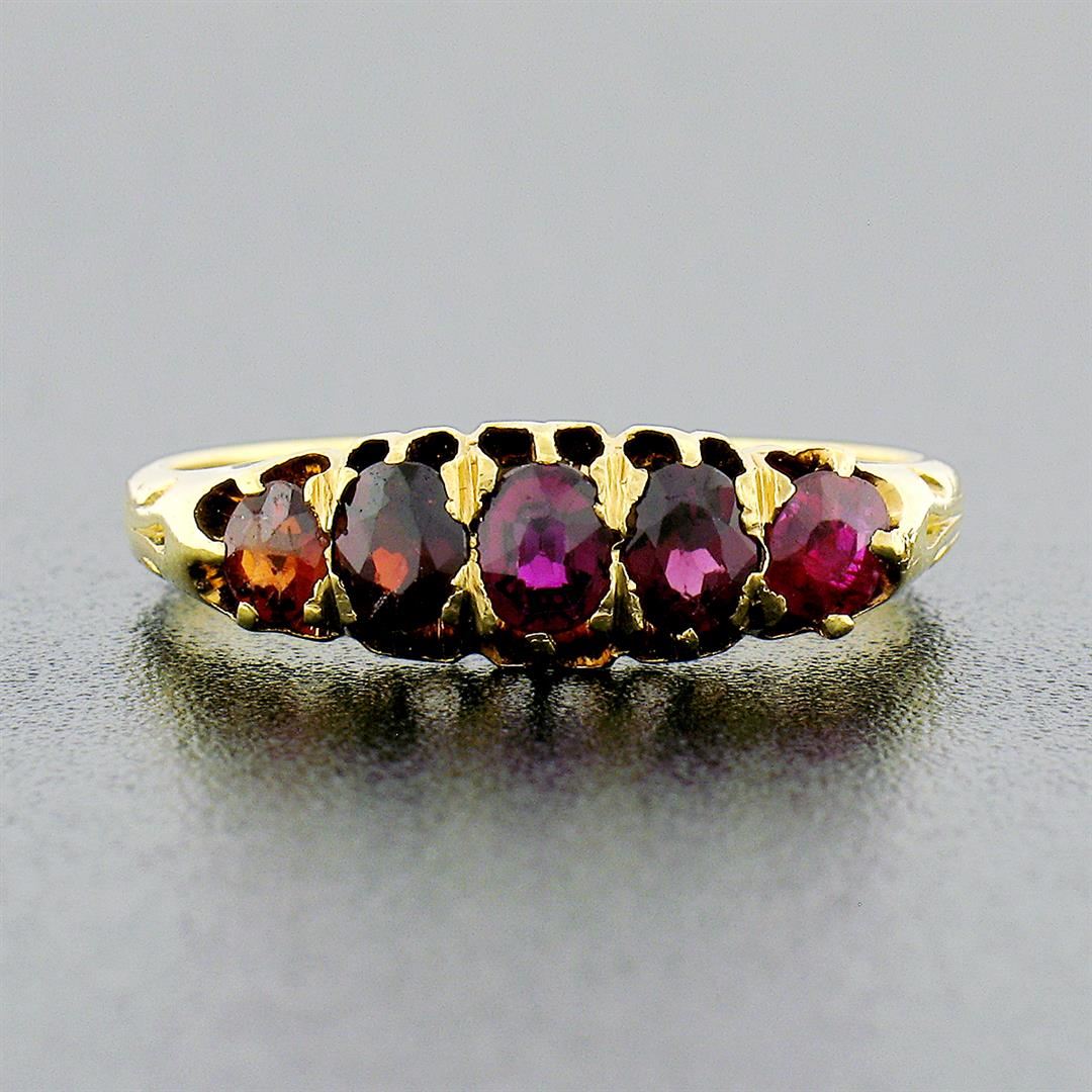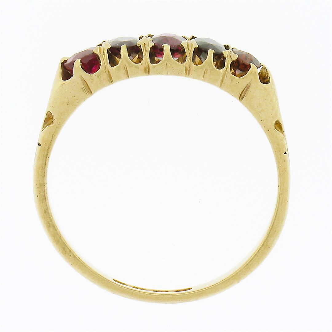 An antique solid 18k yellow gold band ring, with 5 old cut natural spinels (1ctw). The ring is size 7.5, weighs a total of 3.12 grams, and measures 5.7mm wide.