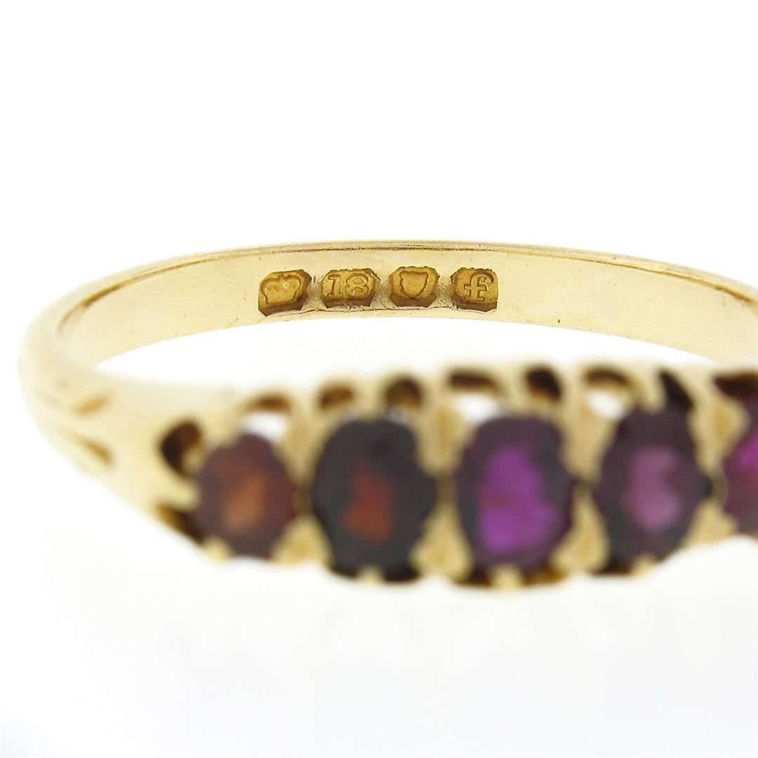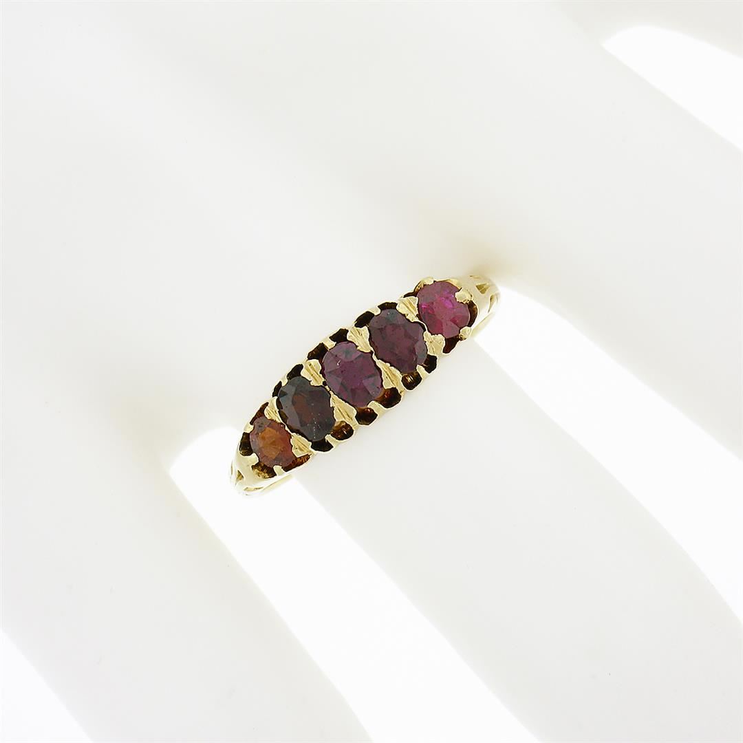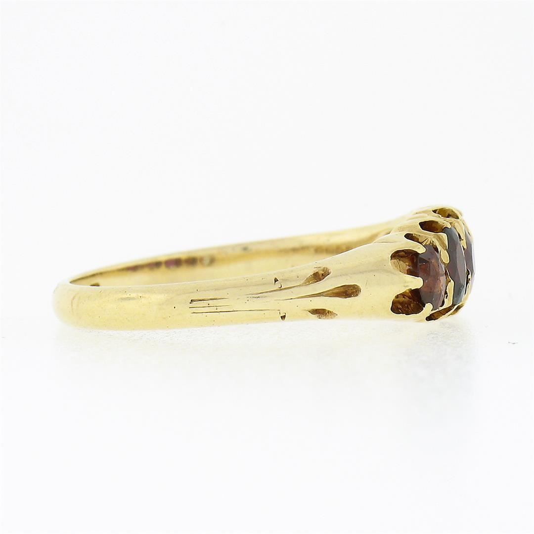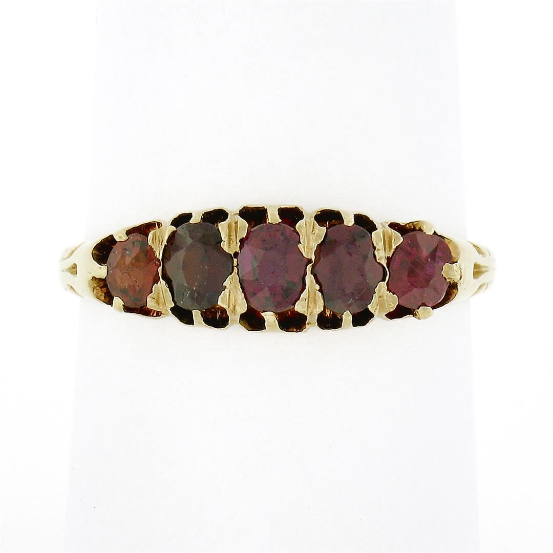 An antique solid 18k yellow gold band ring, with 5 old cut natural spinels (1ctw). The ring is size 7.5, weighs a total of 3.12 grams, and measures 5.7mm wide.