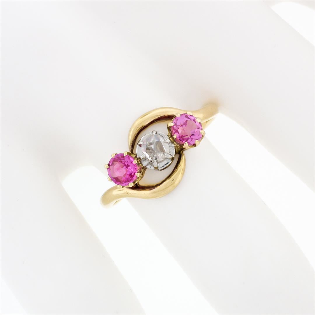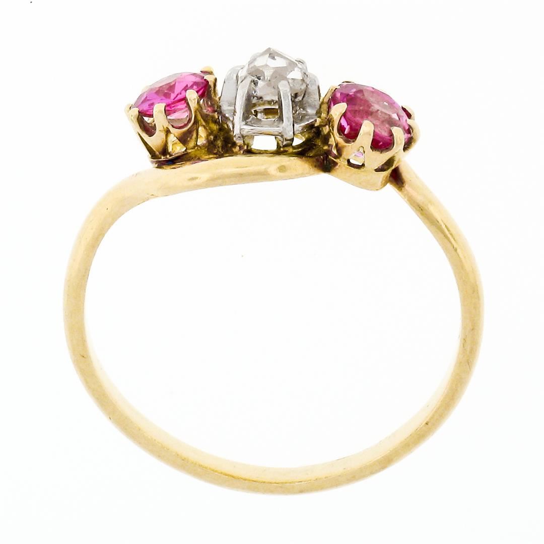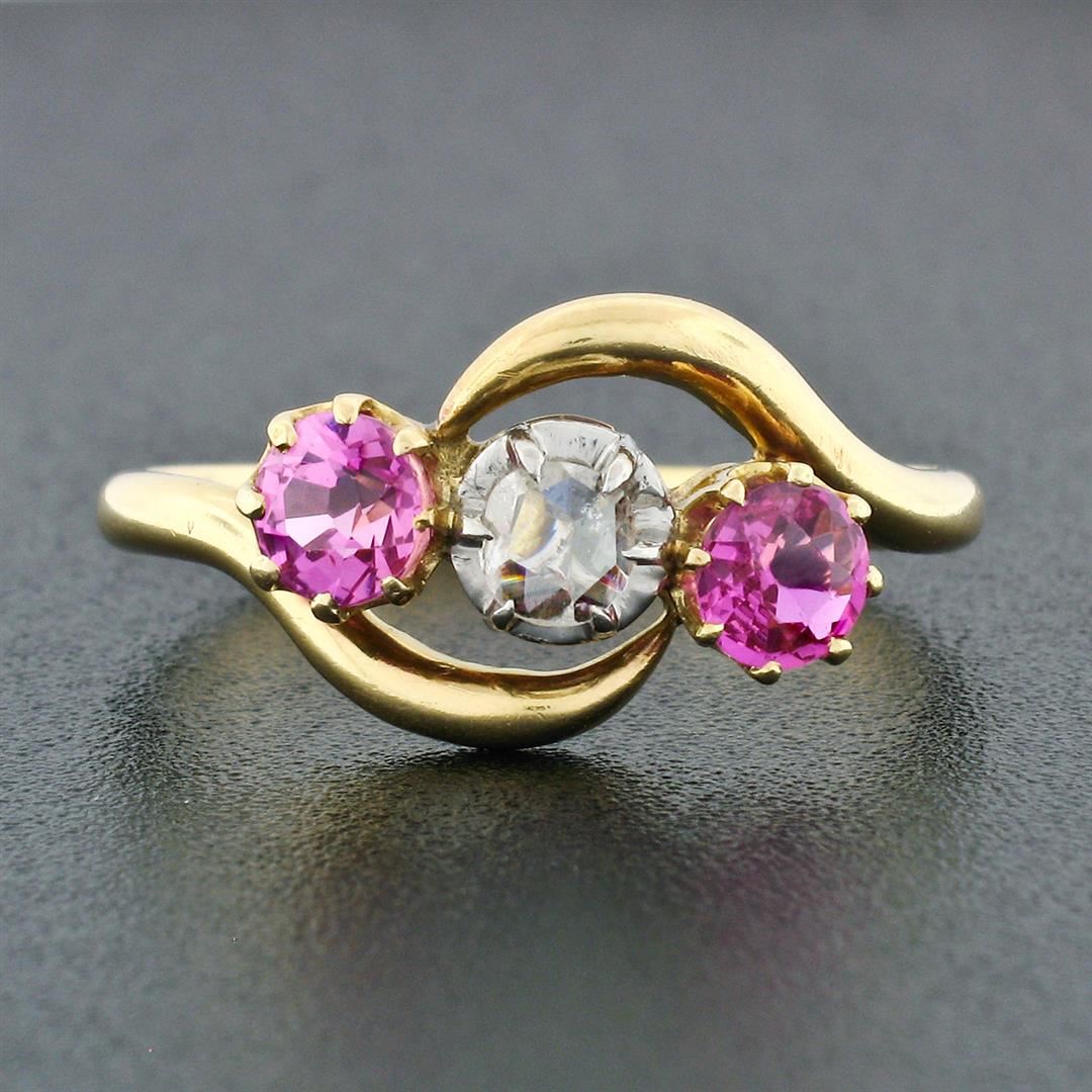 An antique victorian solid 18k yellow gold 3 stones ring, with 1 rose cut natural diamond (G - SI2 ; 0.18ct), and 2 old european cut natural pink sapphires (1.0ctw ). The ring is size 7.5, weighs a total of 3.0 grams, and measures 10.50mm wide.