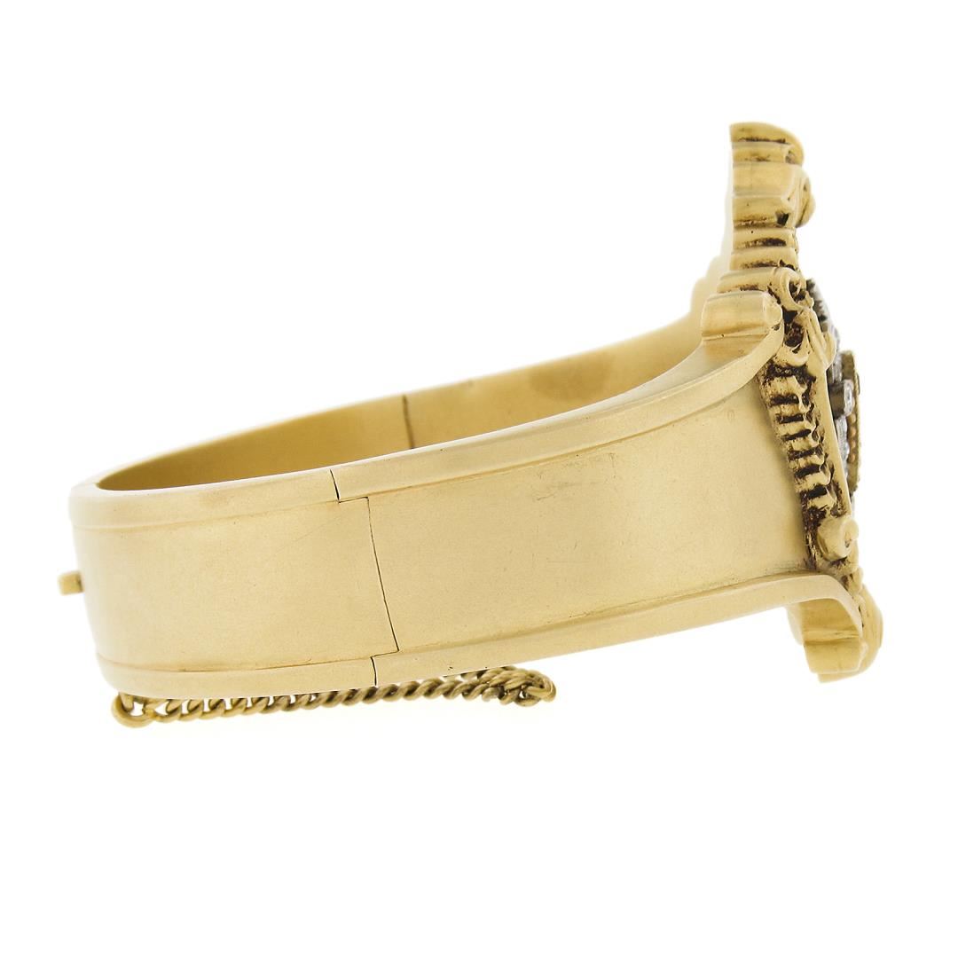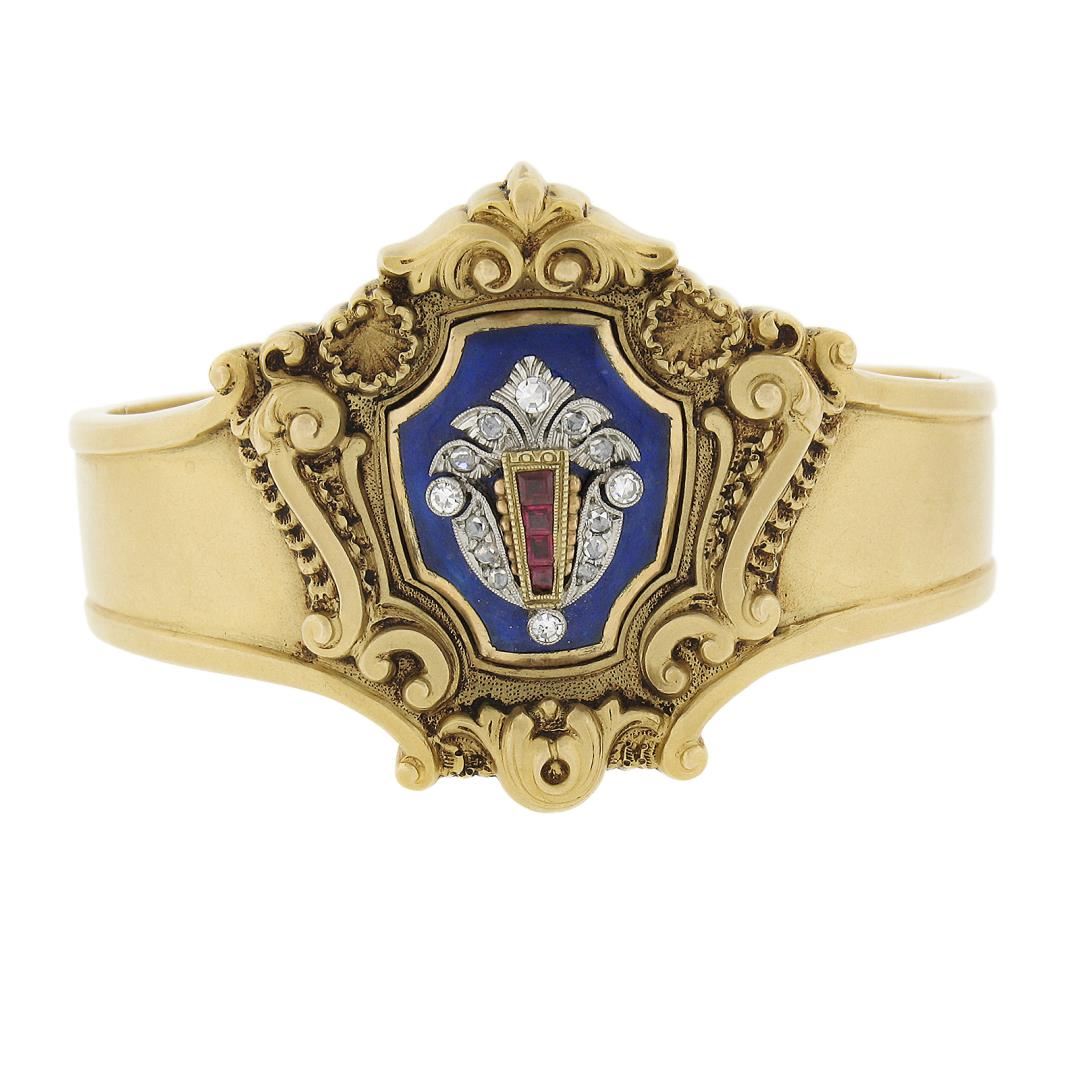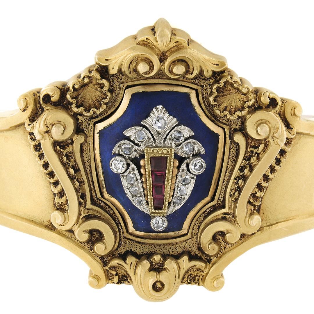 An antique solid 18k yellow gold bangle barcelet, with enamel work, 14 old single & rose cut natural diamonds (G-I - VS2-SI2 ; 0.31ctw), and 4 square step cut natural rubies (0.18ctw). It weighs a total of 72.71 grams, measures 44.3mm wide, and measures 7.25 inches in length.