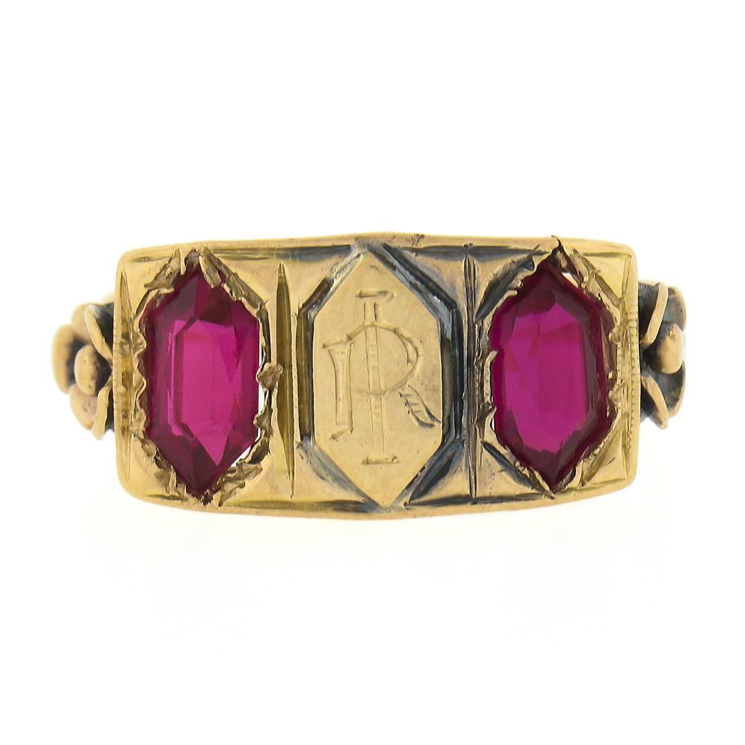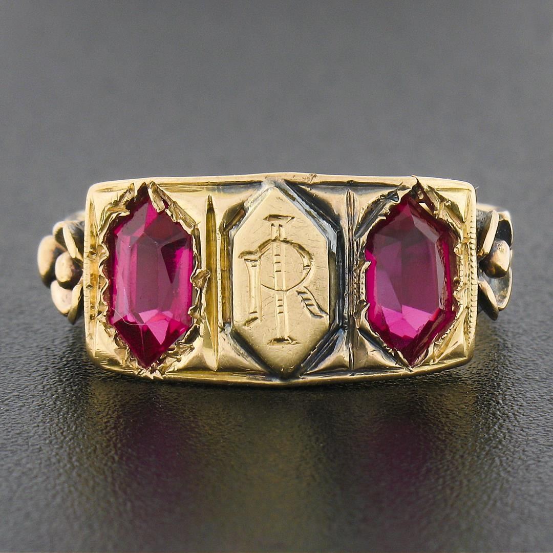 An antique solid 18k rosy yellow gold signet ring, with 2 lozenge kite cut synthetic red stones (8.1x4.5mm & 7.4x4.1mm). The ring is size 10.0, weighs a total of 4.34 grams, and measures 9.9mm wide.