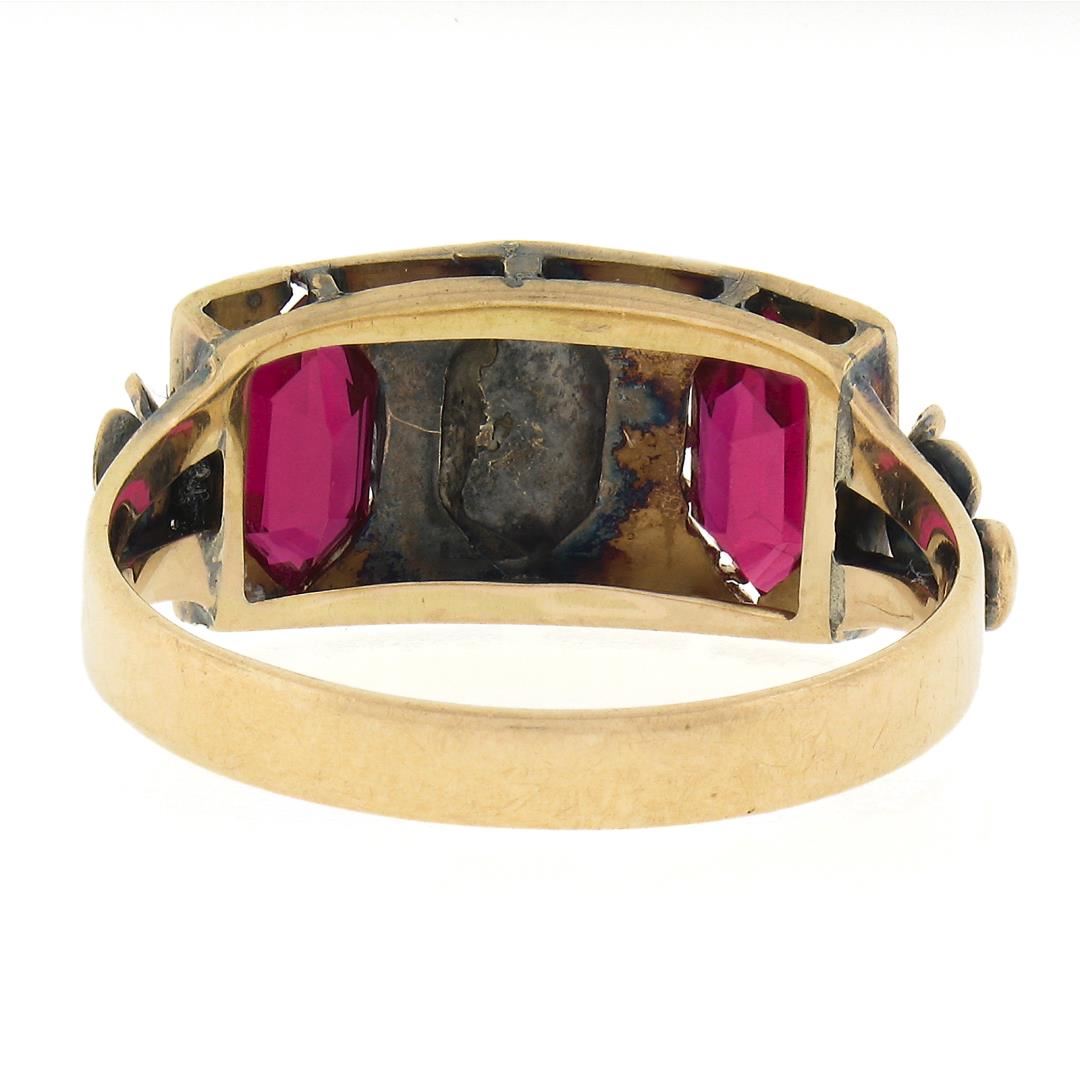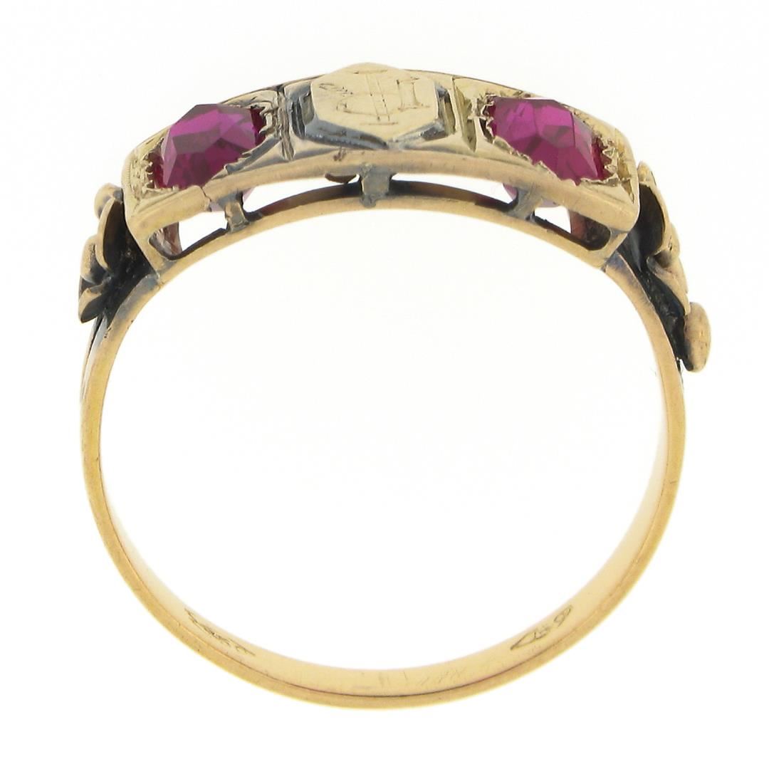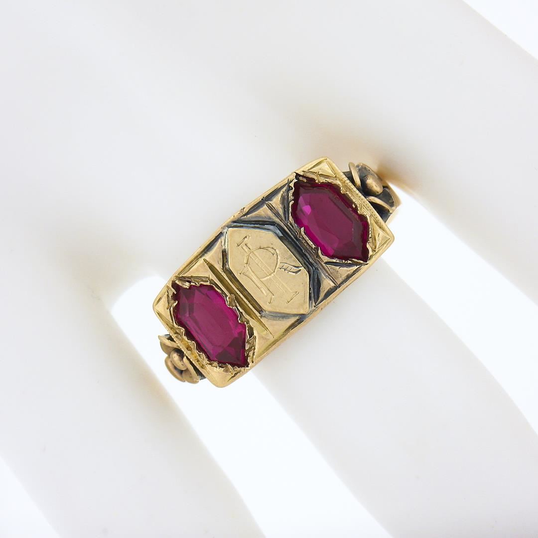 An antique solid 18k rosy yellow gold signet ring, with 2 lozenge kite cut synthetic red stones (8.1x4.5mm & 7.4x4.1mm). The ring is size 10.0, weighs a total of 4.34 grams, and measures 9.9mm wide.