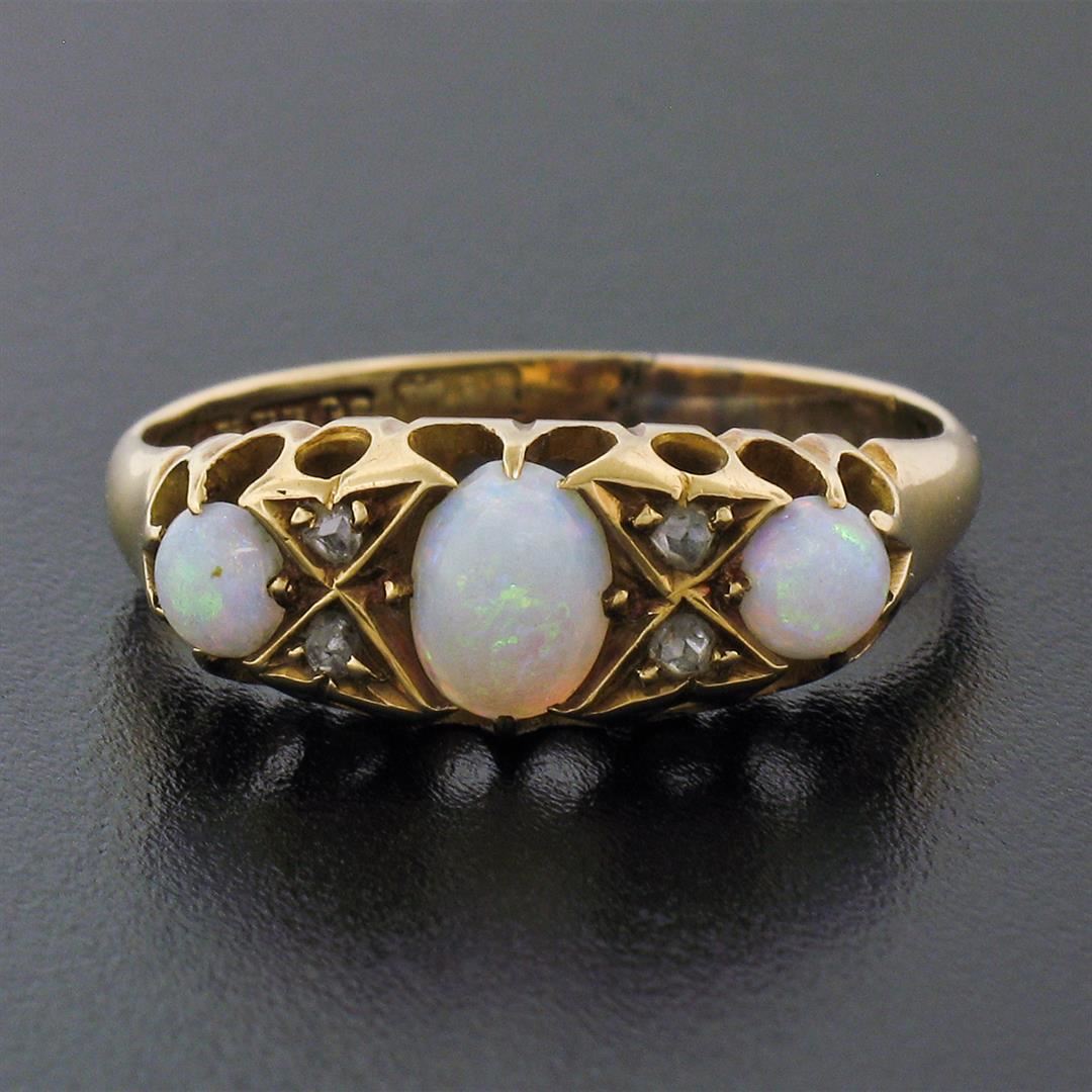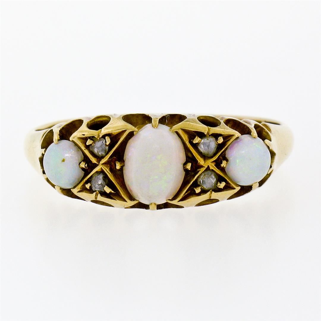 An antique solid 18k yellow gold band ring, featuring 3 oval and round cabochon cut natural opal (6.25x4.35mm (center) / 3.8mm (sides)), with 4 rose cut natural diamonds (G- SI1; 0.10ctw). The ring is size 7.0, weighs a total of 3.29 grams, and measures 6.80mm wide.