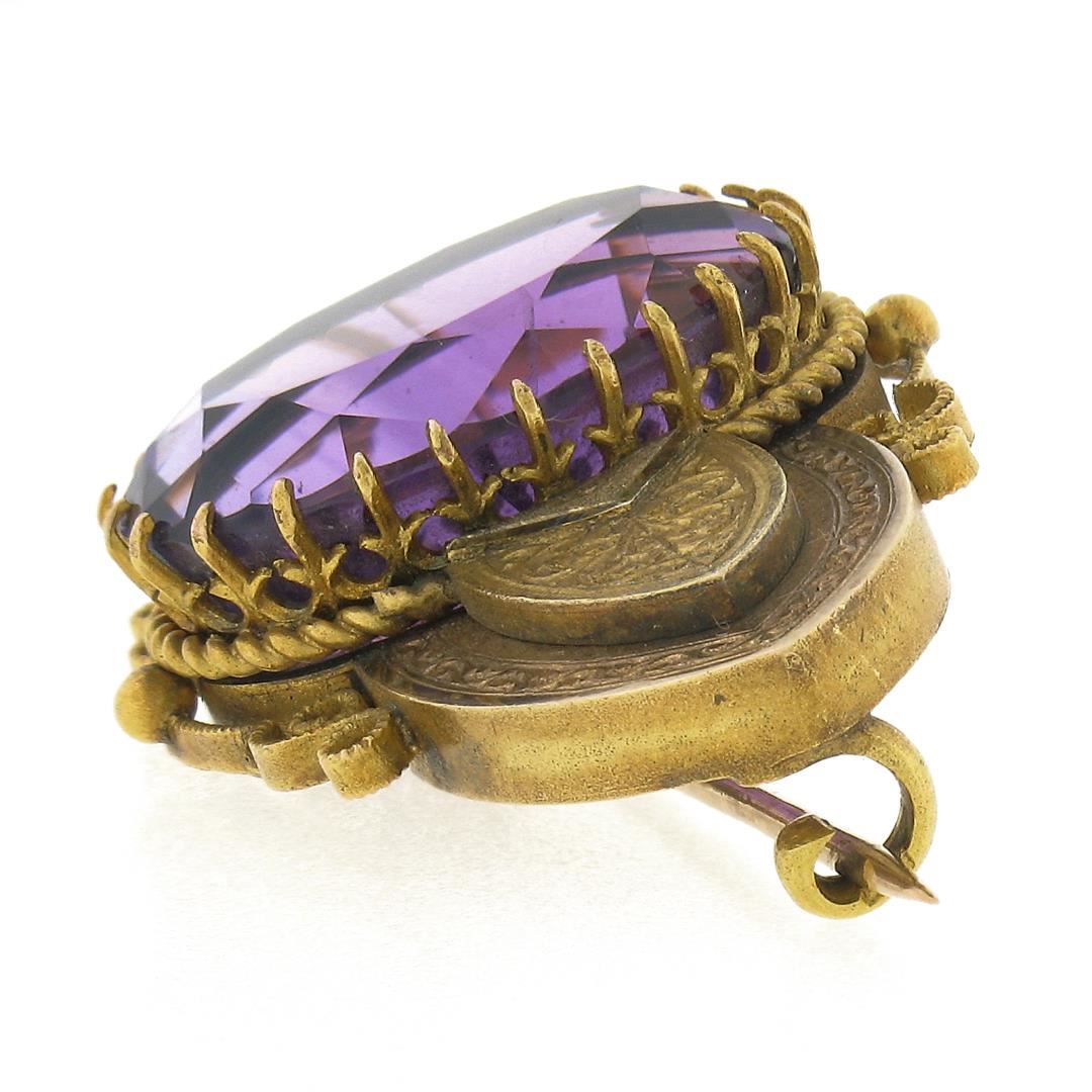 An antique solid 18k yellow gold brooch, with 1 oval cut natural amethyst ( 19x14x9.4mm - 13.50ct). Measures 24x43.9mm and weighs a total of 10.03 grams.