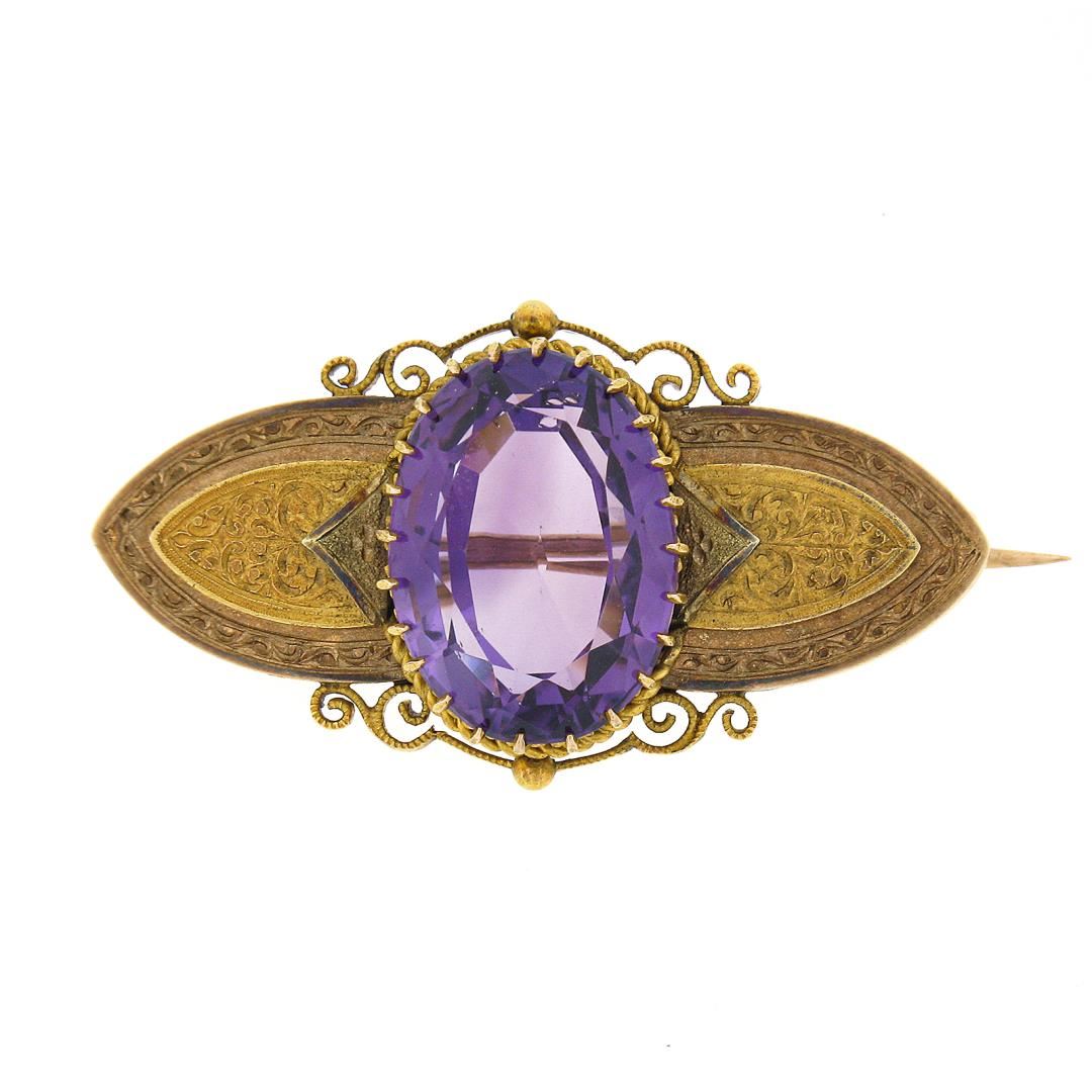 An antique solid 18k yellow gold brooch, with 1 oval cut natural amethyst ( 19x14x9.4mm - 13.50ct). Measures 24x43.9mm and weighs a total of 10.03 grams.