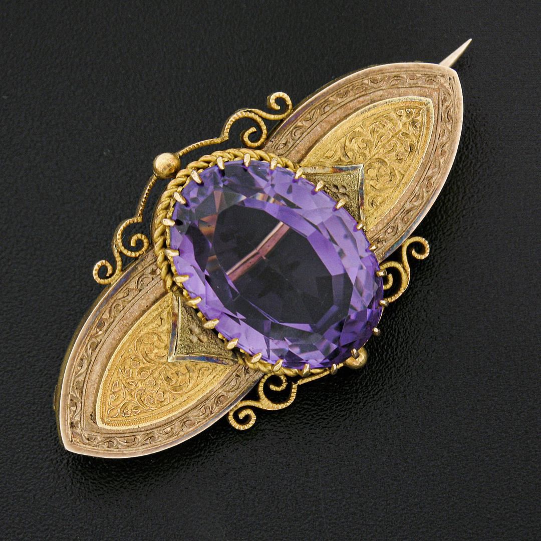 An antique solid 18k yellow gold brooch, with 1 oval cut natural amethyst ( 19x14x9.4mm - 13.50ct). Measures 24x43.9mm and weighs a total of 10.03 grams.
