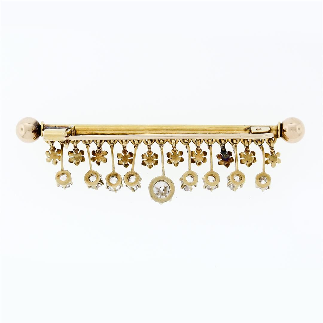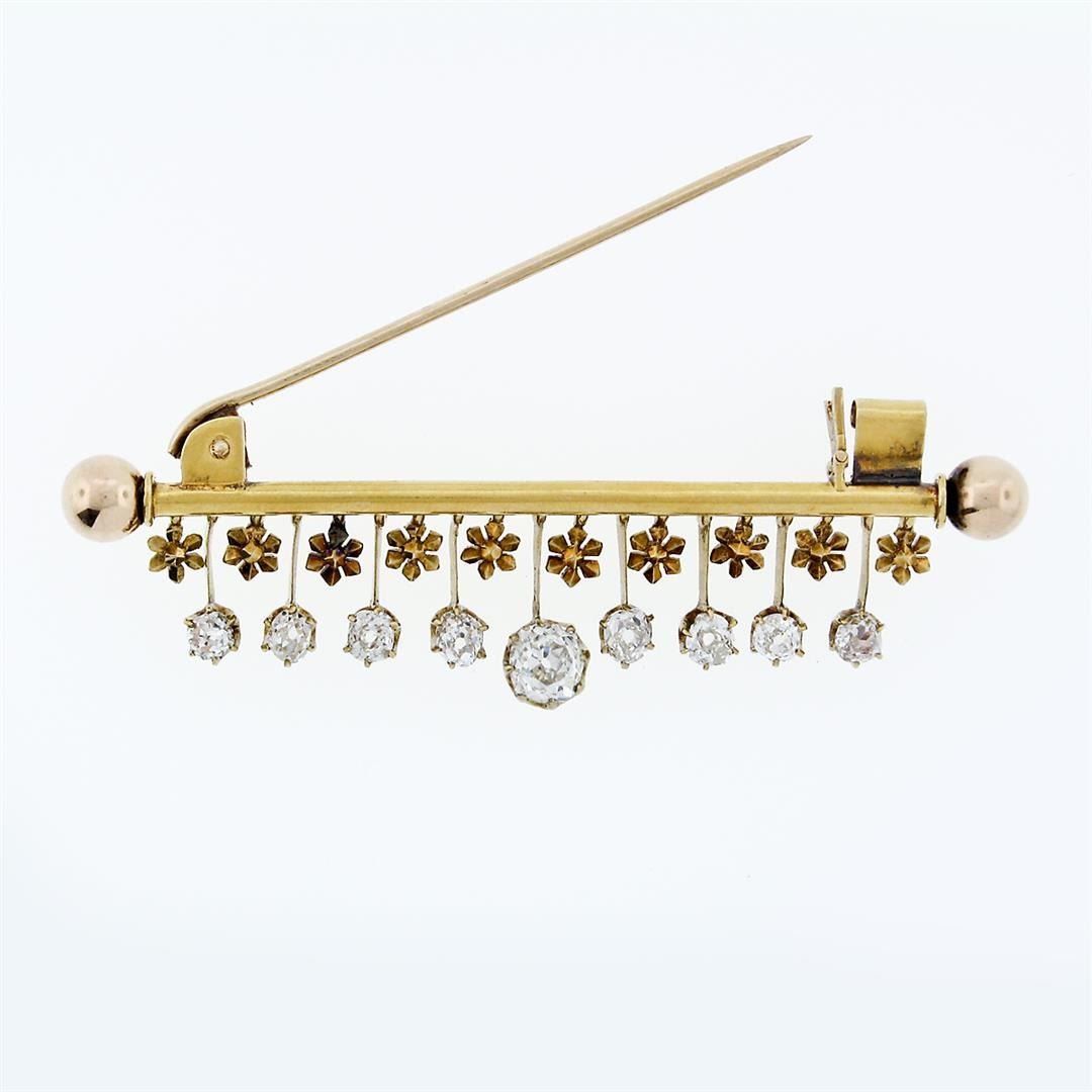 An antique solid 18k yellow gold pin brooch, with 1 cushion old mine cut natural diamond (J- SI1; 0.90ct), and 8 old mine cut natural diamonds (I/J- VS1-SI1; 1.50ctw). Measures 21.49x68.69mm and weighs a total of 11.80 grams.