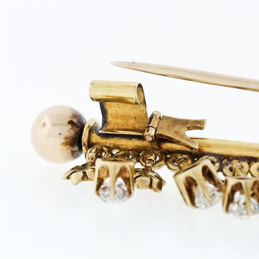 An antique solid 18k yellow gold pin brooch, with 1 cushion old mine cut natural diamond (J- SI1; 0.90ct), and 8 old mine cut natural diamonds (I/J- VS1-SI1; 1.50ctw). Measures 21.49x68.69mm and weighs a total of 11.80 grams.