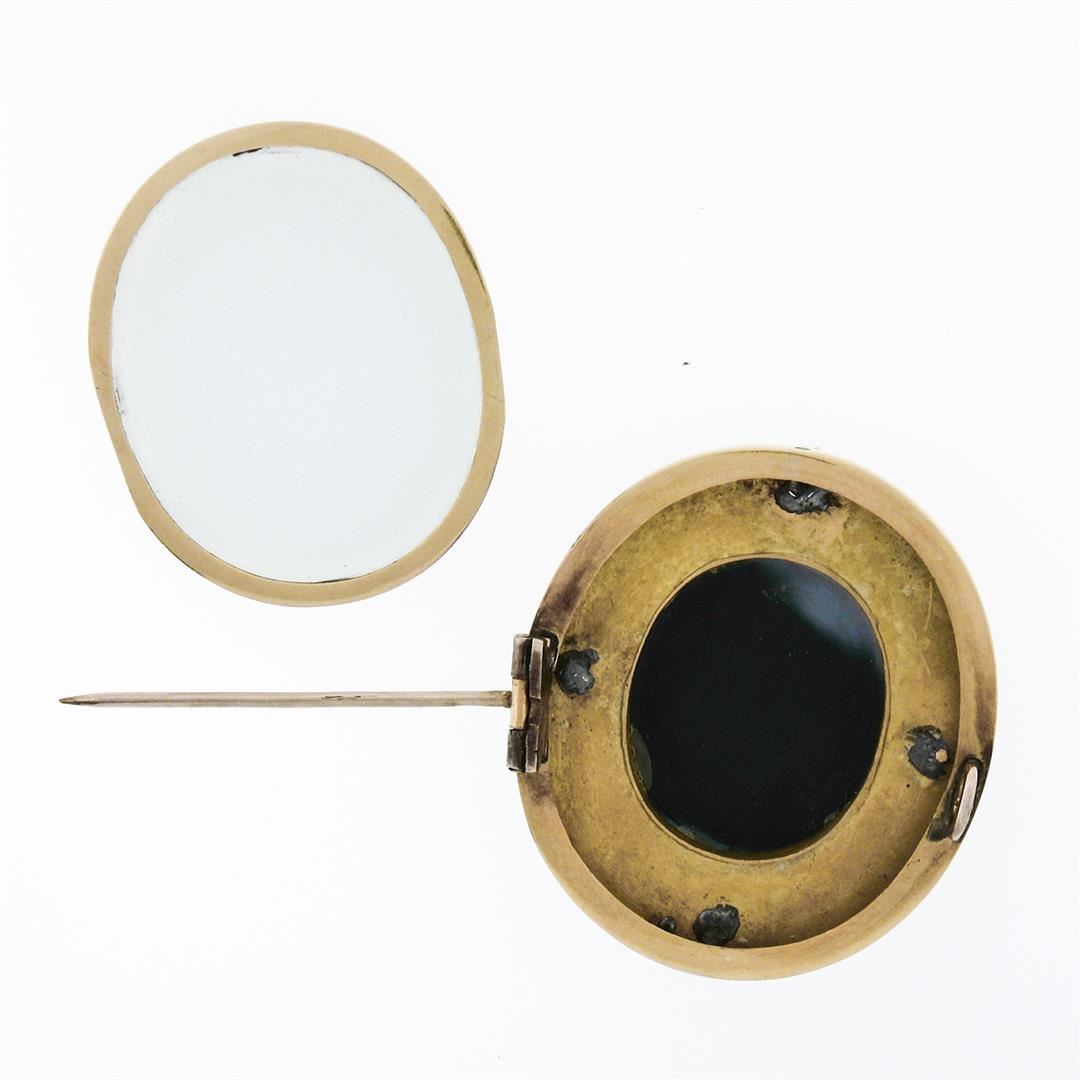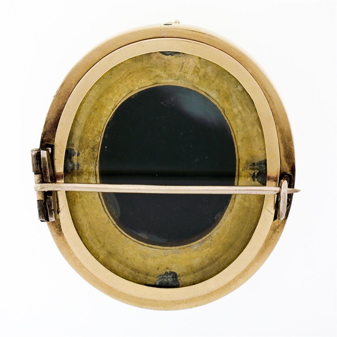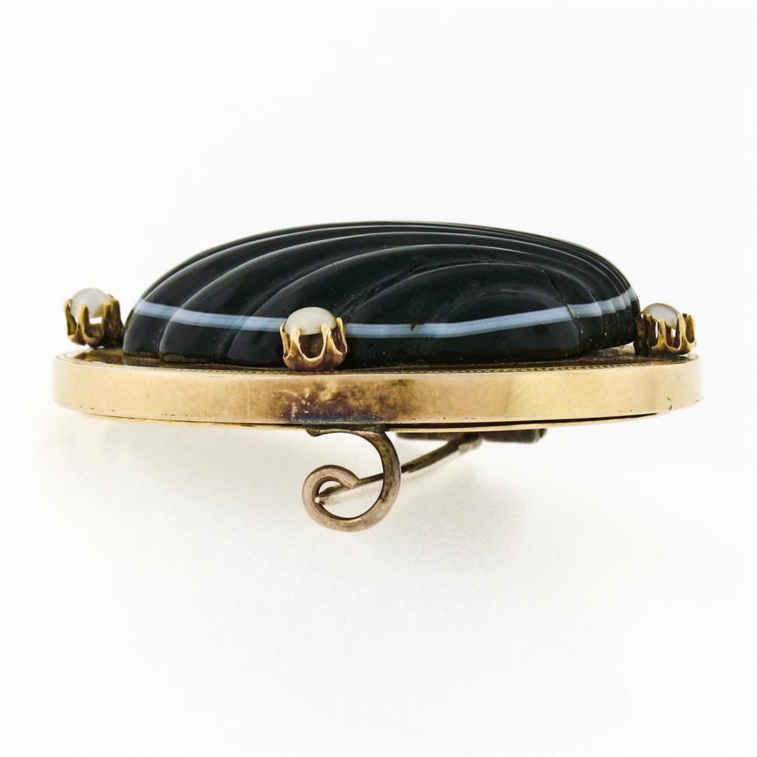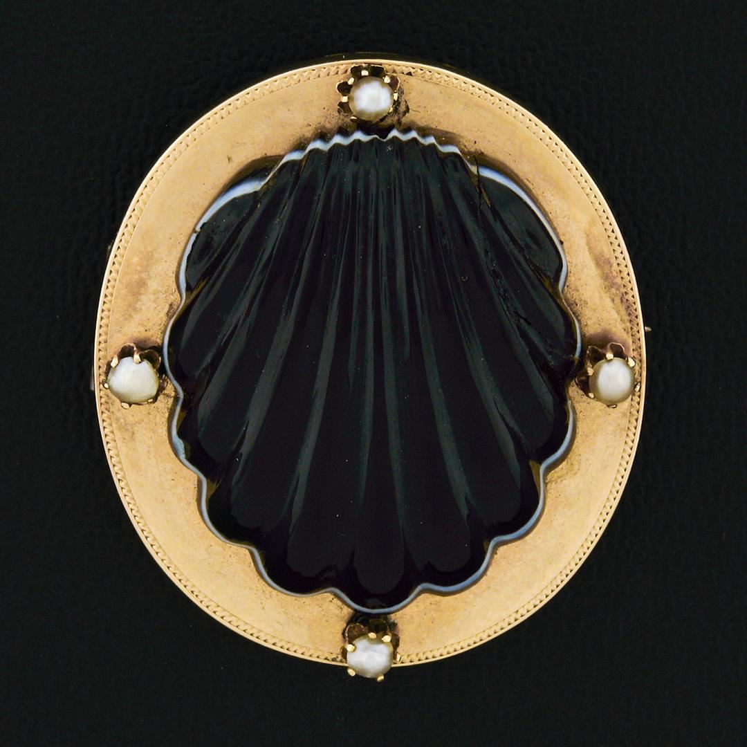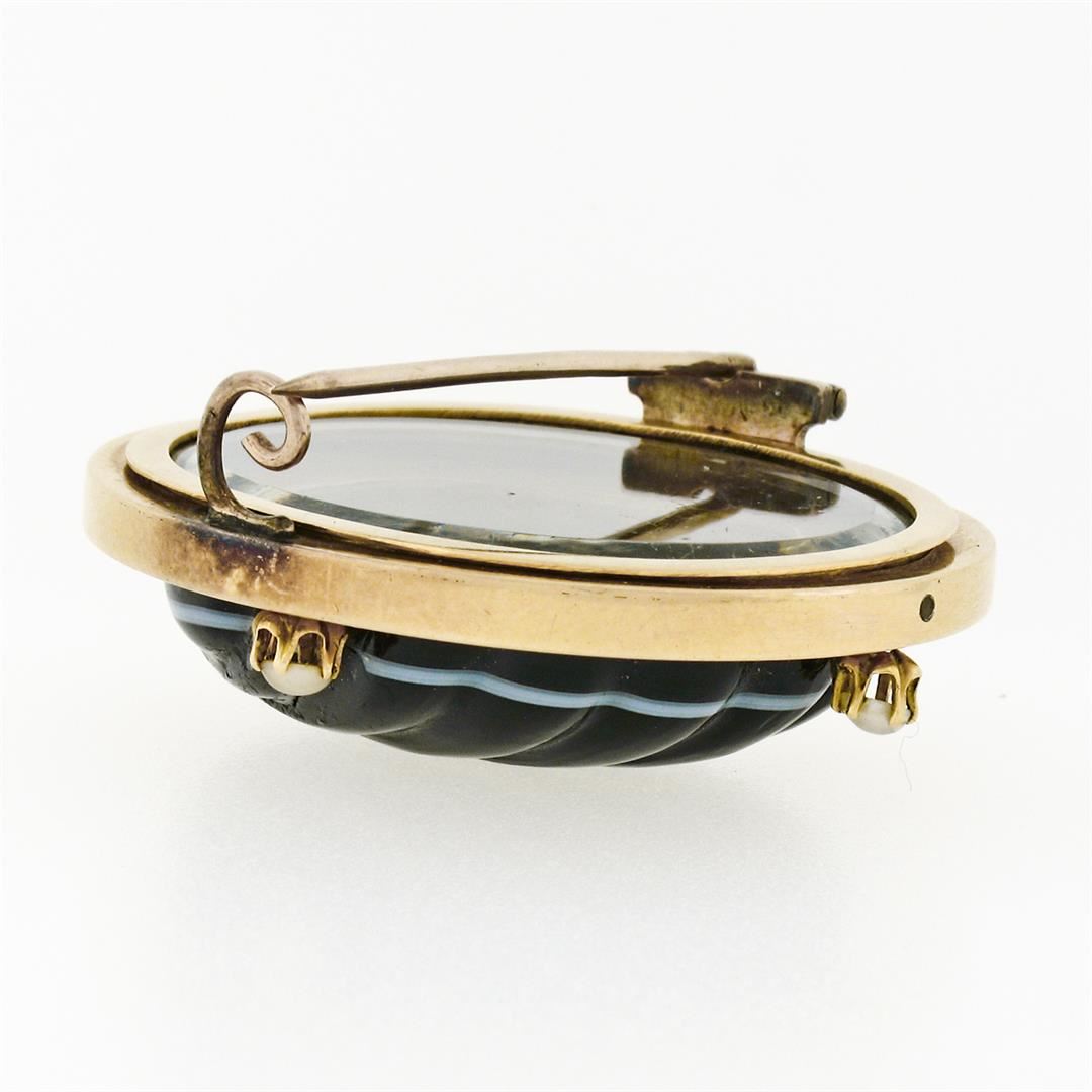 An antique solid 18k yellow gold locket brooch, with 1 carved natural banded agate (31.61x26.15mm), and 4 round cabochon cut natural cultured pearls (3.0mm). Measures 40.03x35.37mm and weighs a total of 19.67 grams.