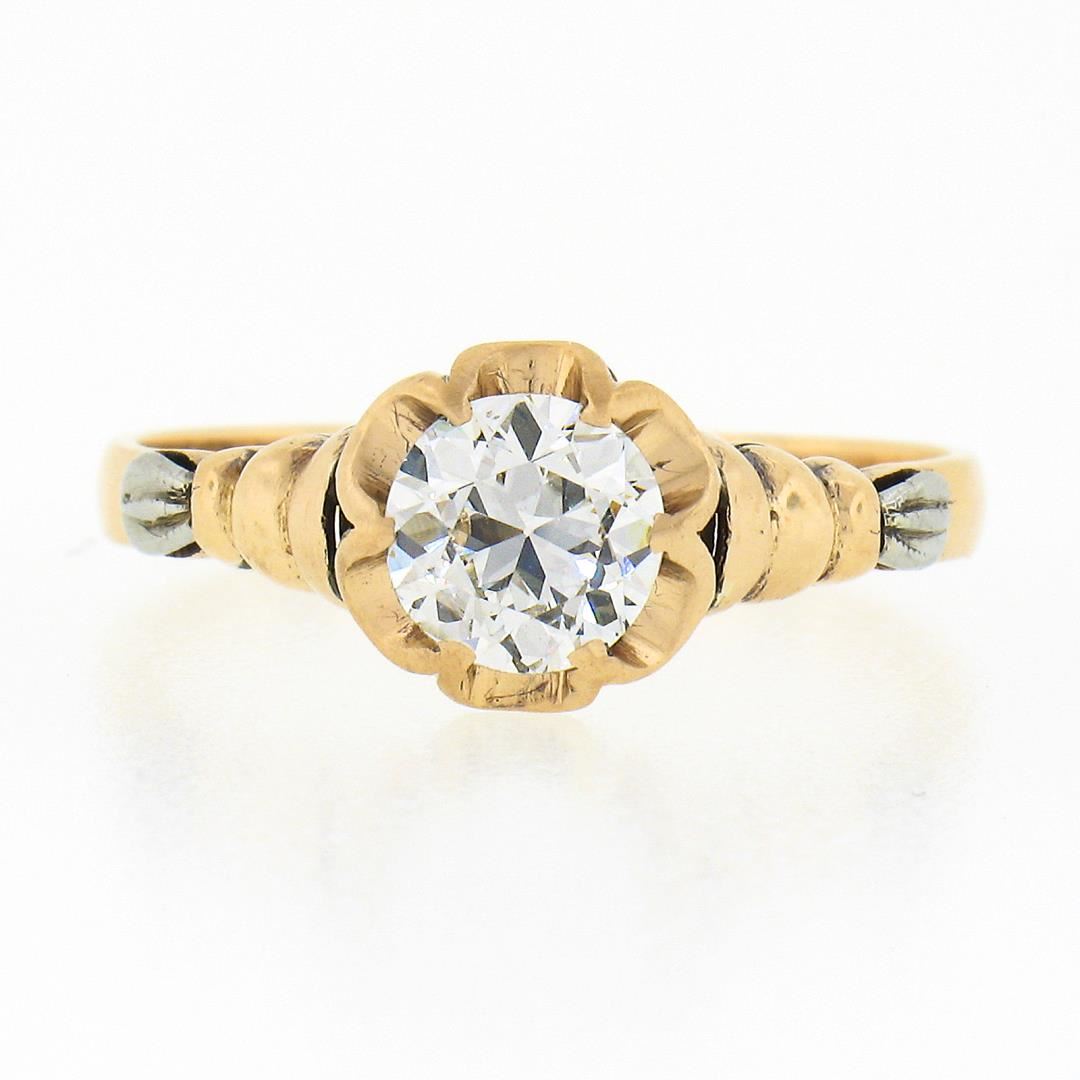 An antique solid 18k rosy yellow & white gold engagement ring, with 1 GIA graded old European cut natural diamond (K - SI2 ; 0.75ct ). The ring is size 7.0, weighs a total of 2.36 grams, and measures 7.75mm wide. Comes with all original relevant certifications.