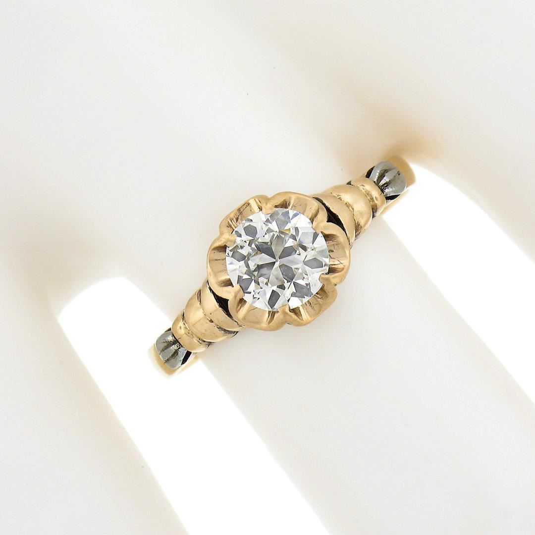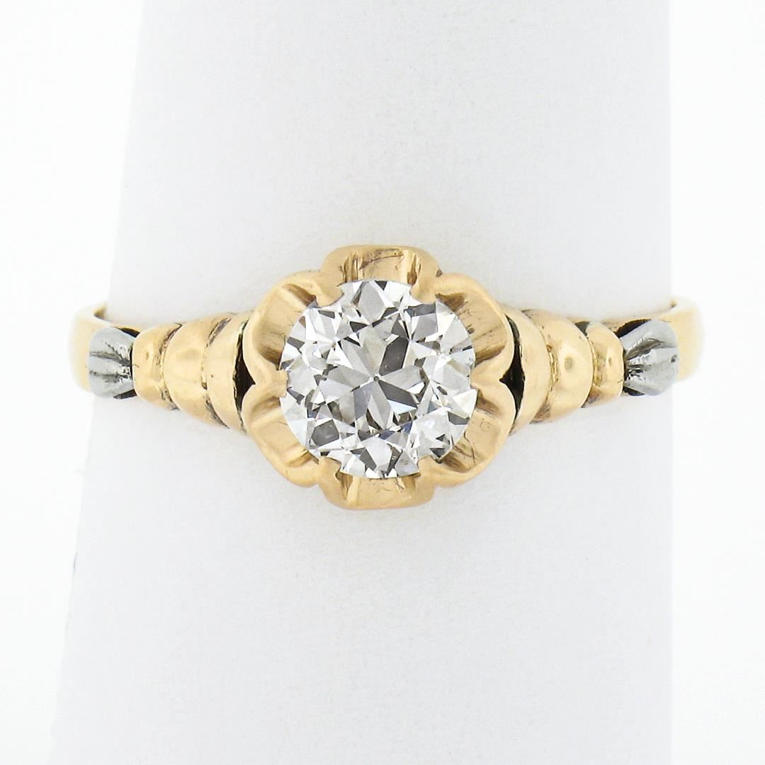 An antique solid 18k rosy yellow & white gold engagement ring, with 1 GIA graded old European cut natural diamond (K - SI2 ; 0.75ct ). The ring is size 7.0, weighs a total of 2.36 grams, and measures 7.75mm wide. Comes with all original relevant certifications.