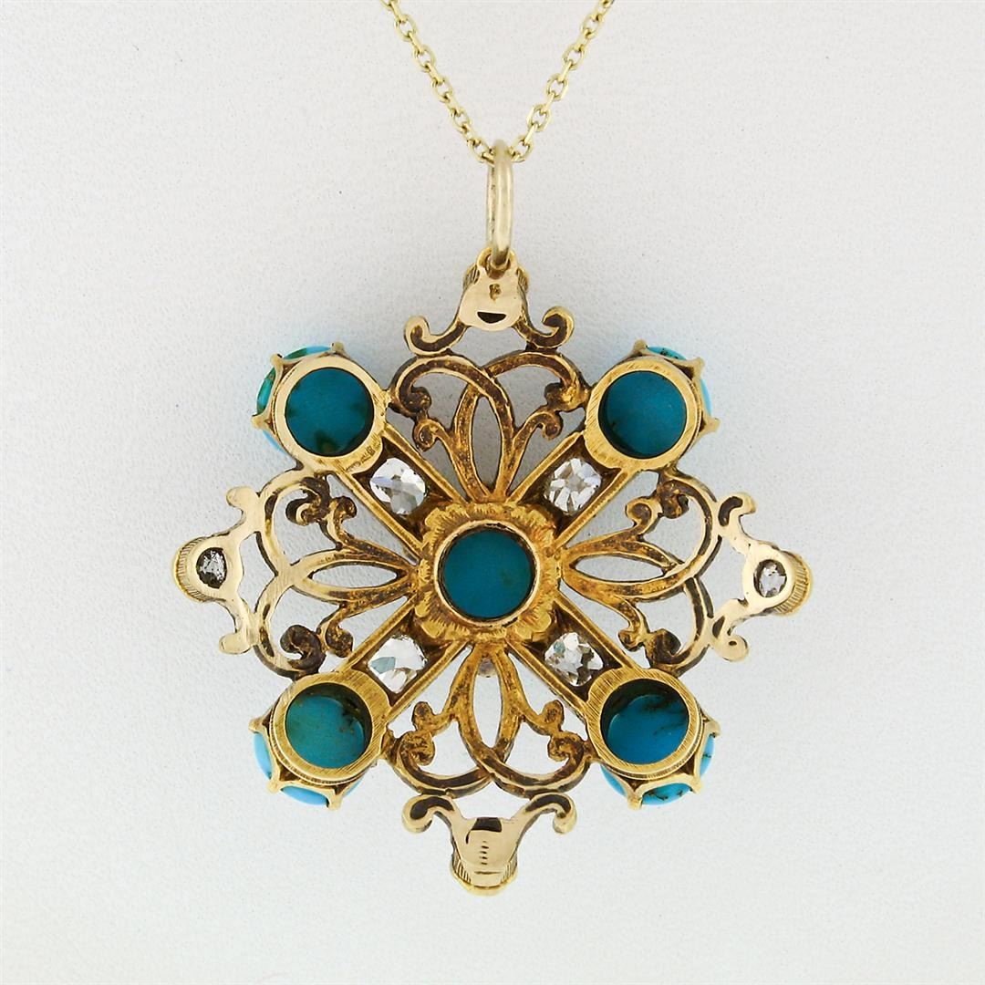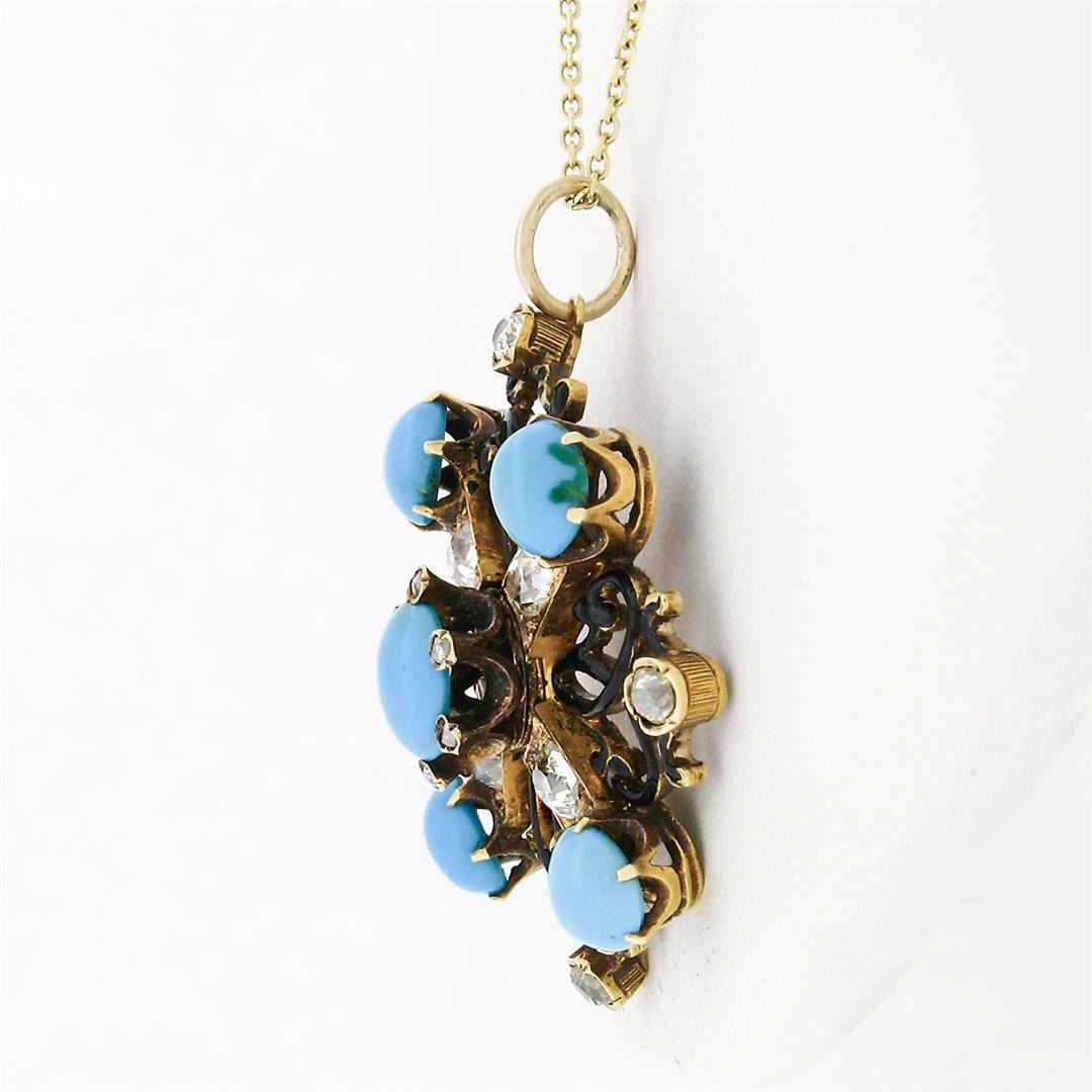 A Victorian solid 18k rosy yellow gold pendant necklace, with 1 oval cabochon cut natural turquoise (7.67x6.19mm), and round cabochon cut natural turquoise (6.05mm), with 4 oval old mine cut natural diamonds (H/I - VS1/VS2 ; 1.00ctw), and 4 old mine cut n
