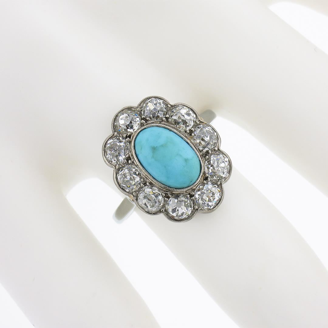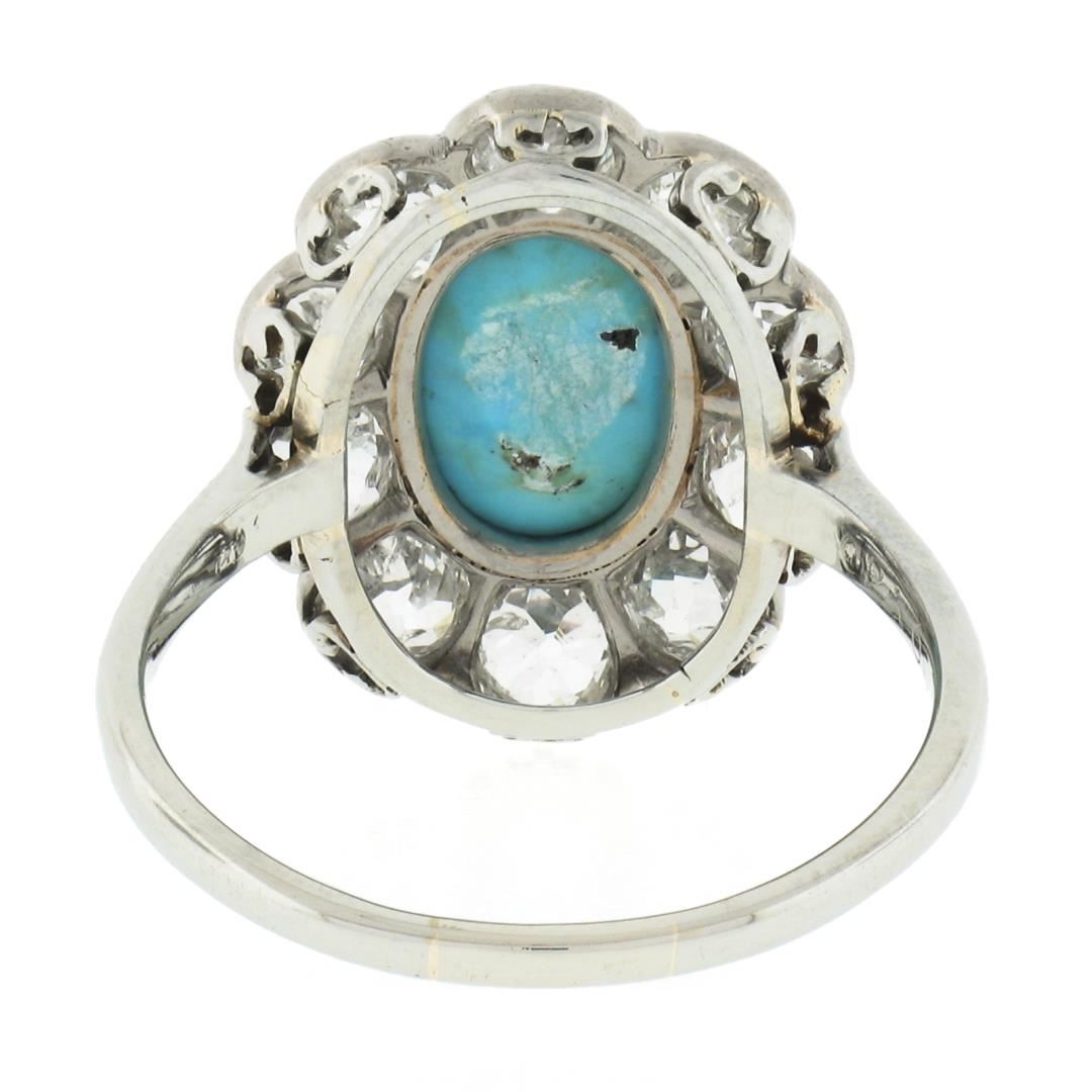An antique solid 18k white gold ring, with 1 oval cabochon cut natural turquoise (9.5x6.3mm), surrounded with a halo of 10 old mine cut natural diamonds (G-I - VS2-SI2 w/ a Few I1 ; 1.70ctw). The ring is size 7.0, weighs a total of 3.94 grams, and measures 17.75mm wide.