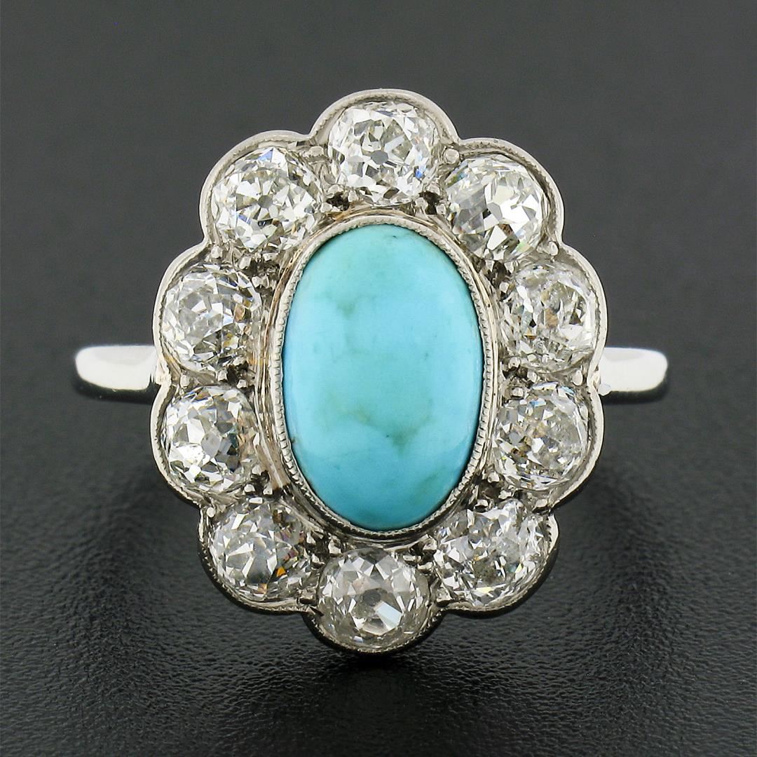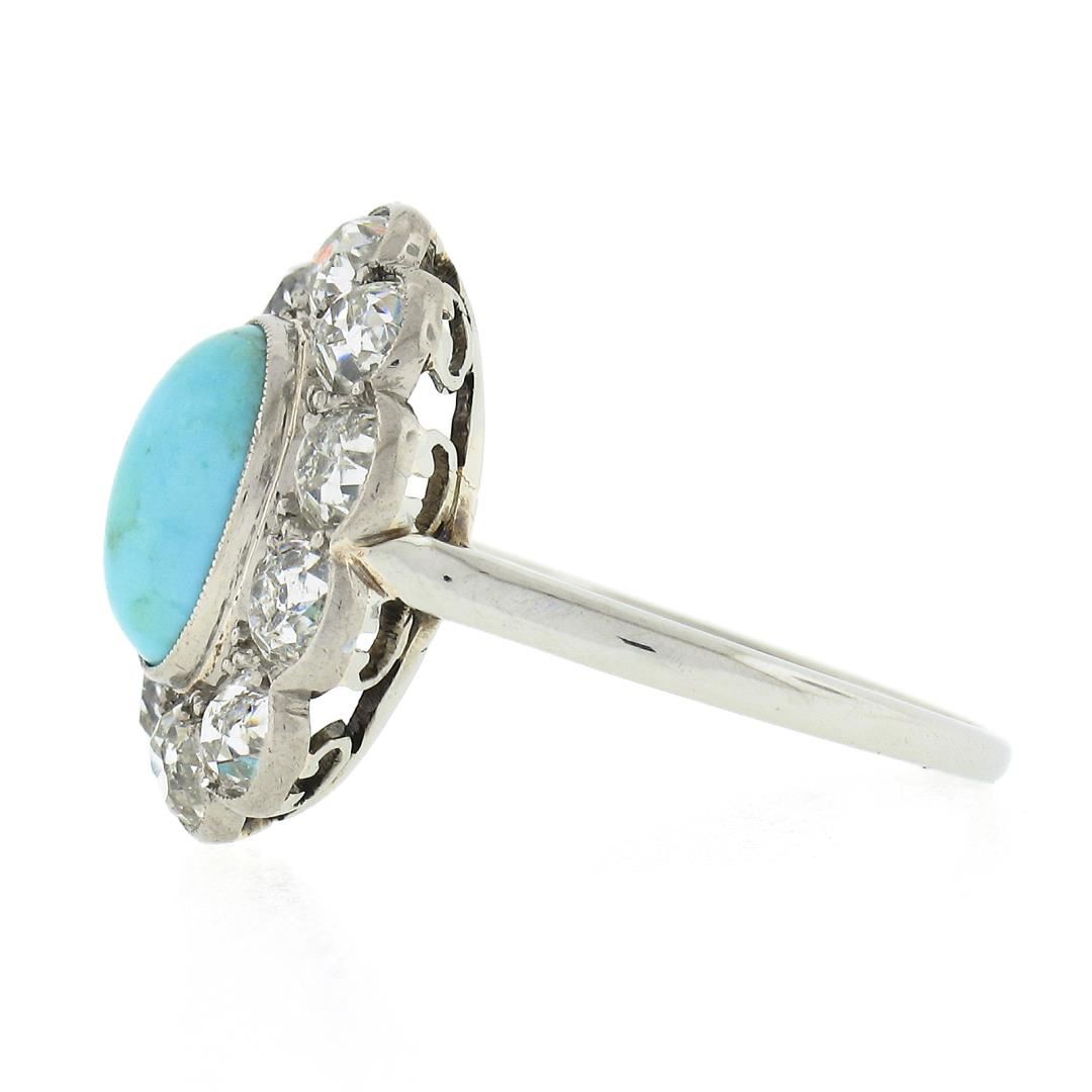 An antique solid 18k white gold ring, with 1 oval cabochon cut natural turquoise (9.5x6.3mm), surrounded with a halo of 10 old mine cut natural diamonds (G-I - VS2-SI2 w/ a Few I1 ; 1.70ctw). The ring is size 7.0, weighs a total of 3.94 grams, and measures 17.75mm wide.