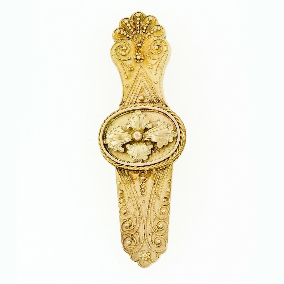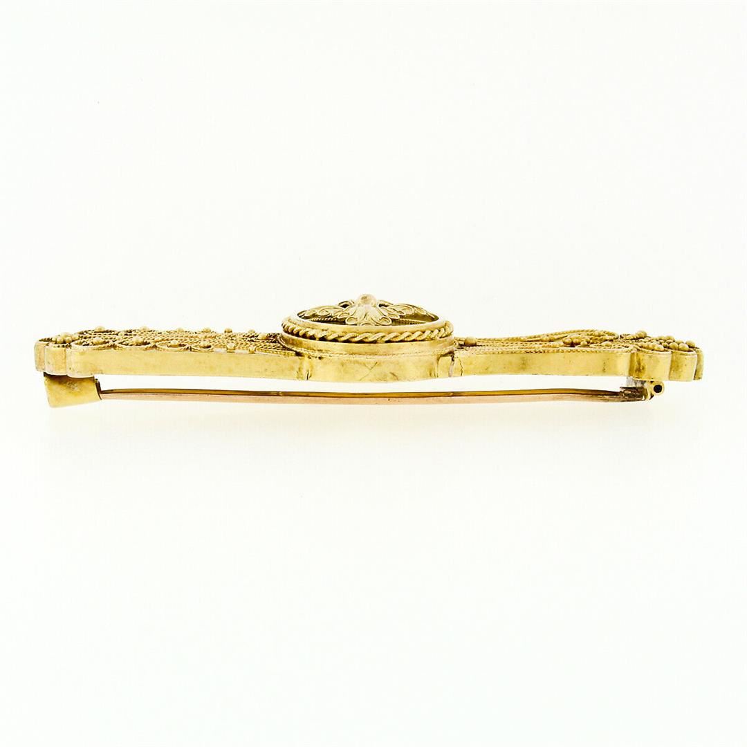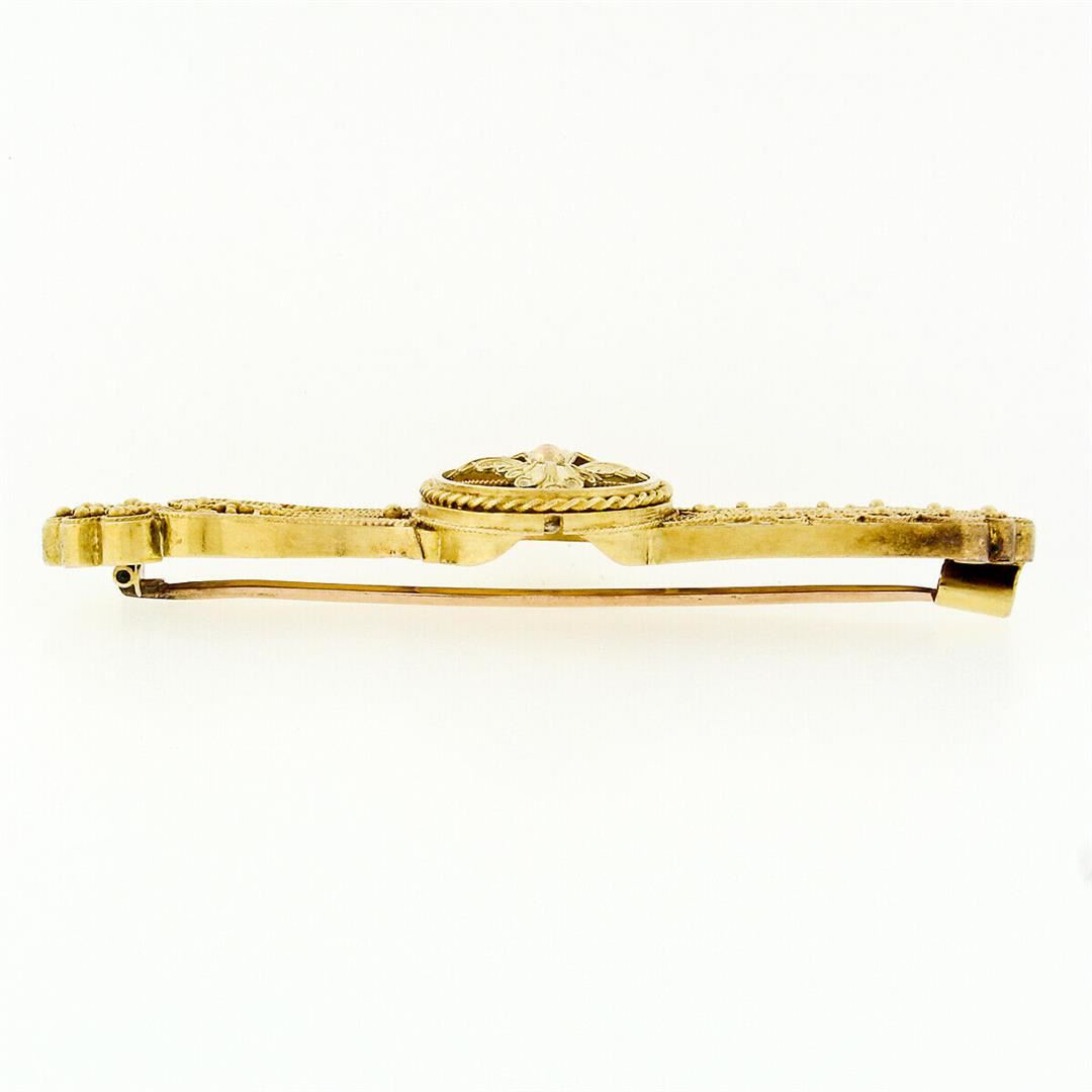 A Victorian era solid 18k yellow gold brooch with Etruscan bead work and twisted wire. Measures 24.8x72.9mm and weighs a total of 10.60 grams.