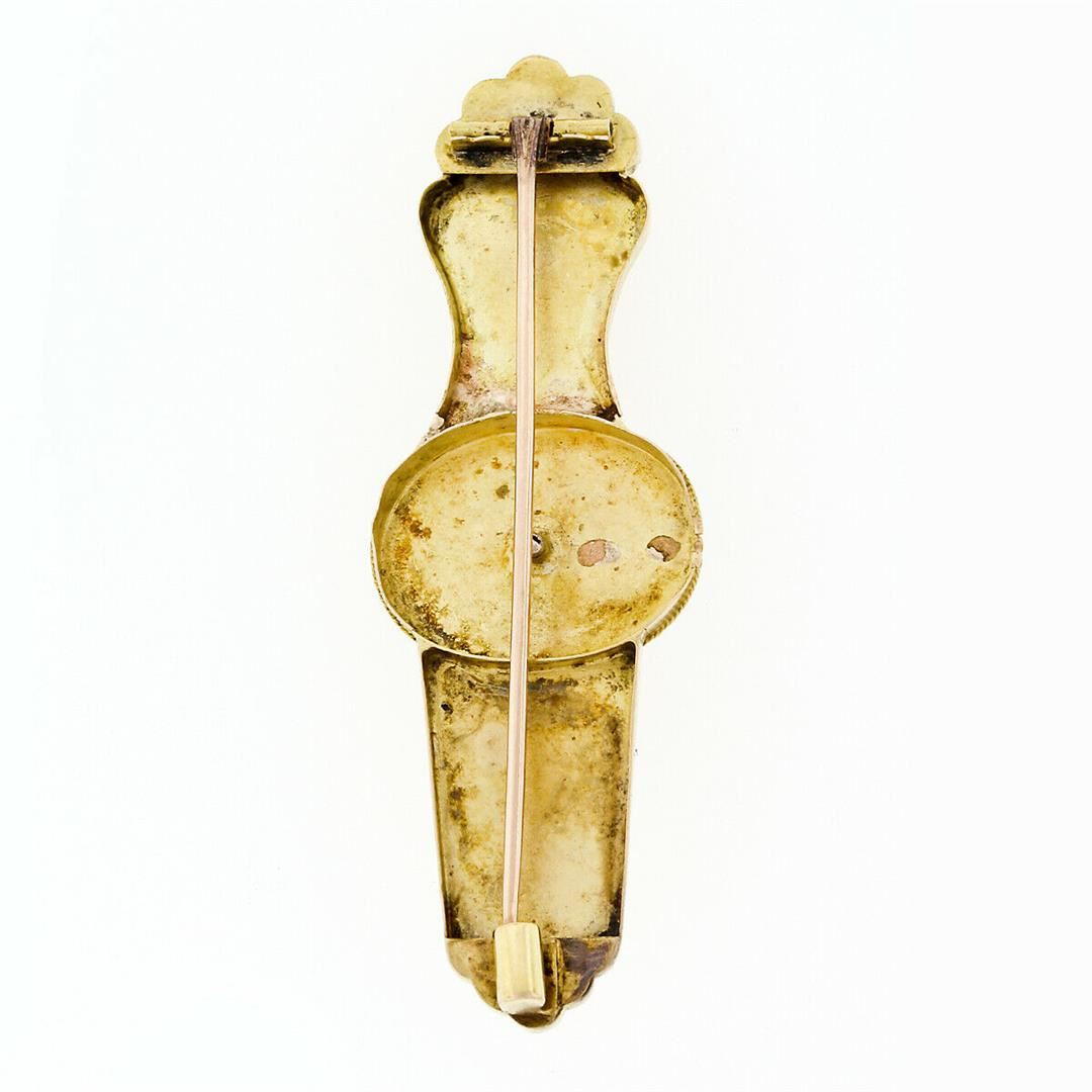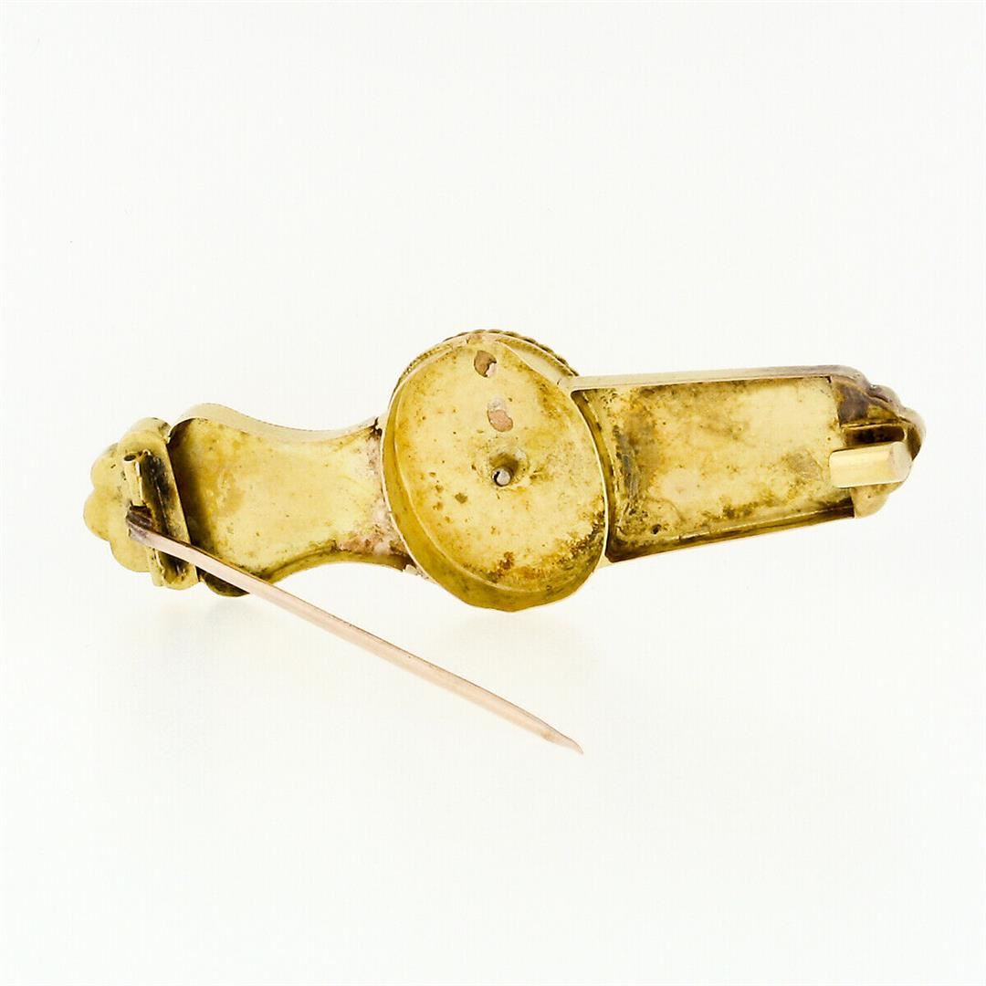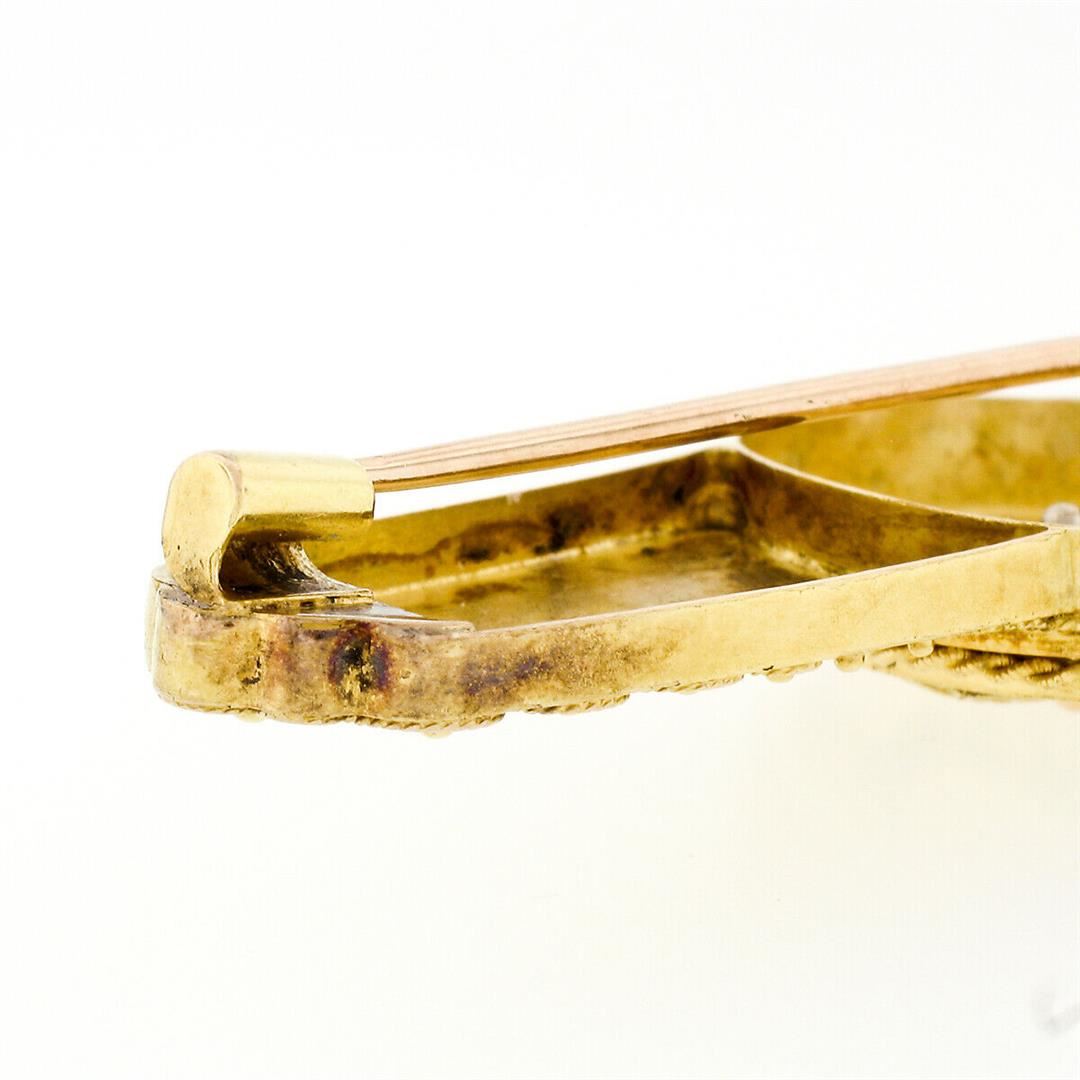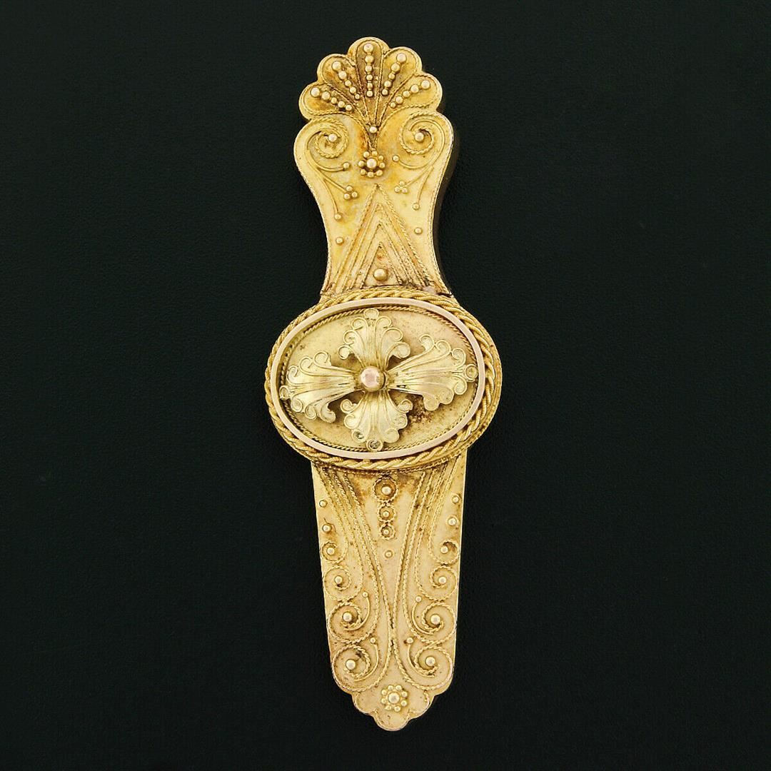 A Victorian era solid 18k yellow gold brooch with Etruscan bead work and twisted wire. Measures 24.8x72.9mm and weighs a total of 10.60 grams.
