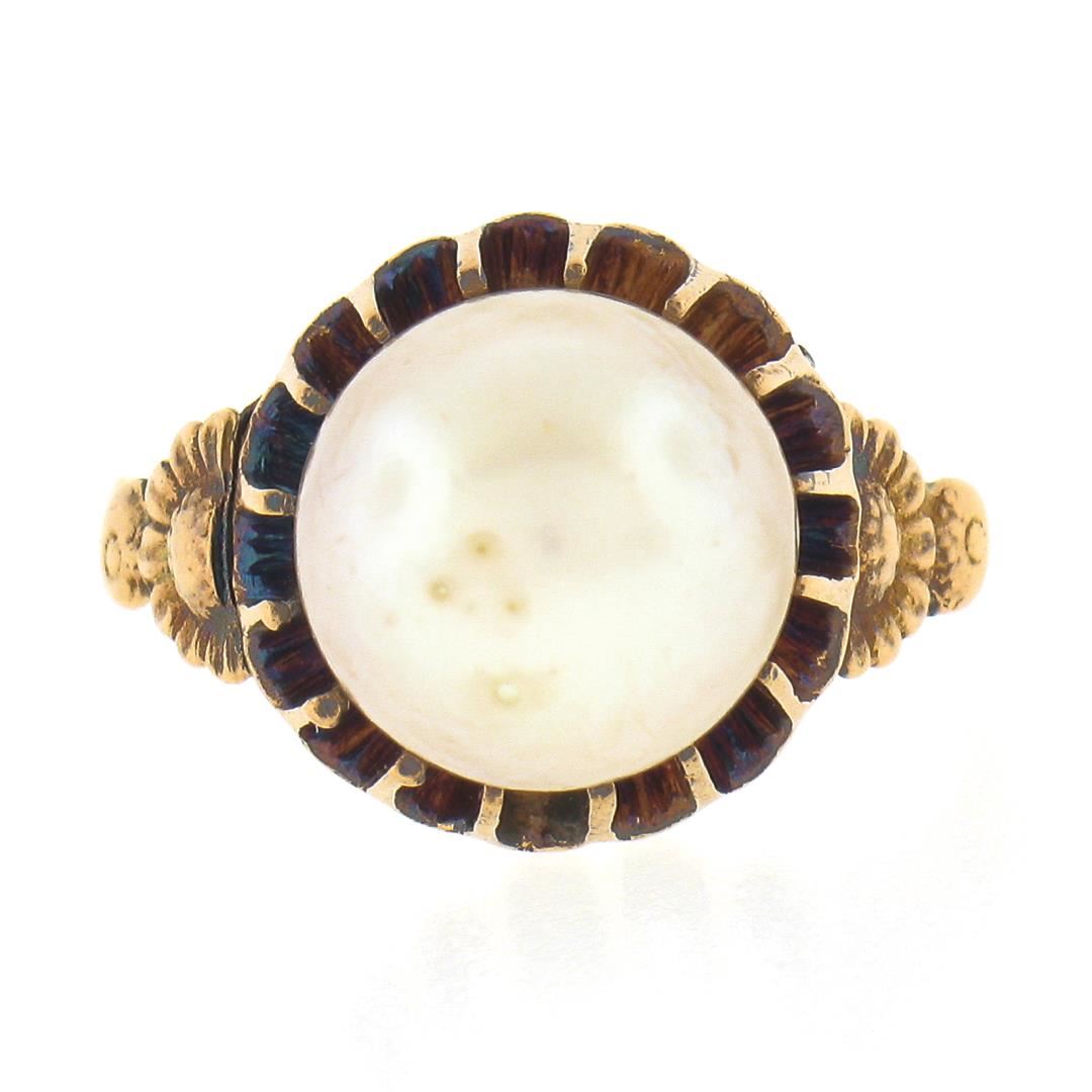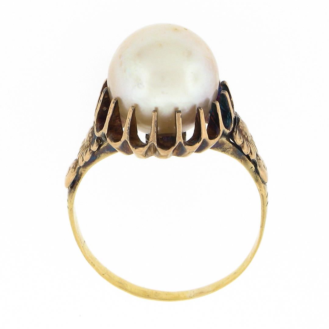 An antique solid 18k yellow gold ring, with 1 GIA graded round shape cultured pearl (9.46mm). The ring is size 5.5, weighs a total of 3.71 grams, and measures 12.25mm wide. Comes with all original relevant certifications.