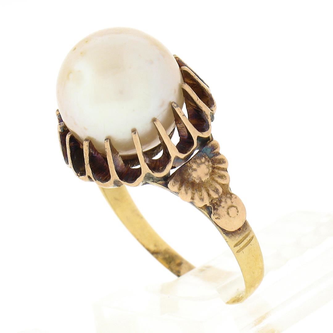 An antique solid 18k yellow gold ring, with 1 GIA graded round shape cultured pearl (9.46mm). The ring is size 5.5, weighs a total of 3.71 grams, and measures 12.25mm wide. Comes with all original relevant certifications.