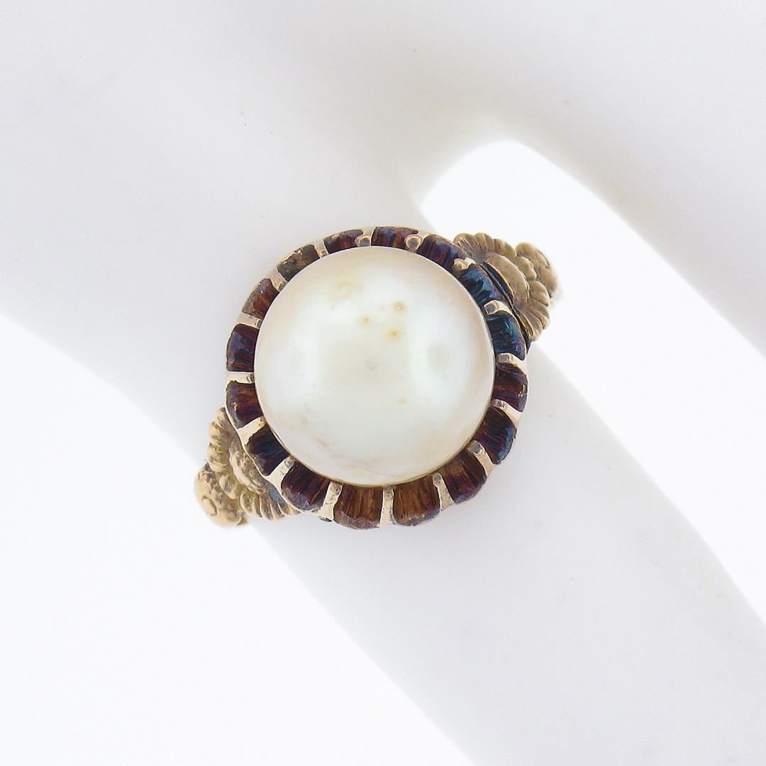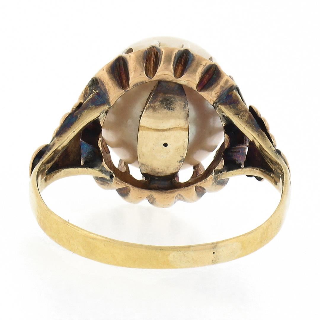 An antique solid 18k yellow gold ring, with 1 GIA graded round shape cultured pearl (9.46mm). The ring is size 5.5, weighs a total of 3.71 grams, and measures 12.25mm wide. Comes with all original relevant certifications.