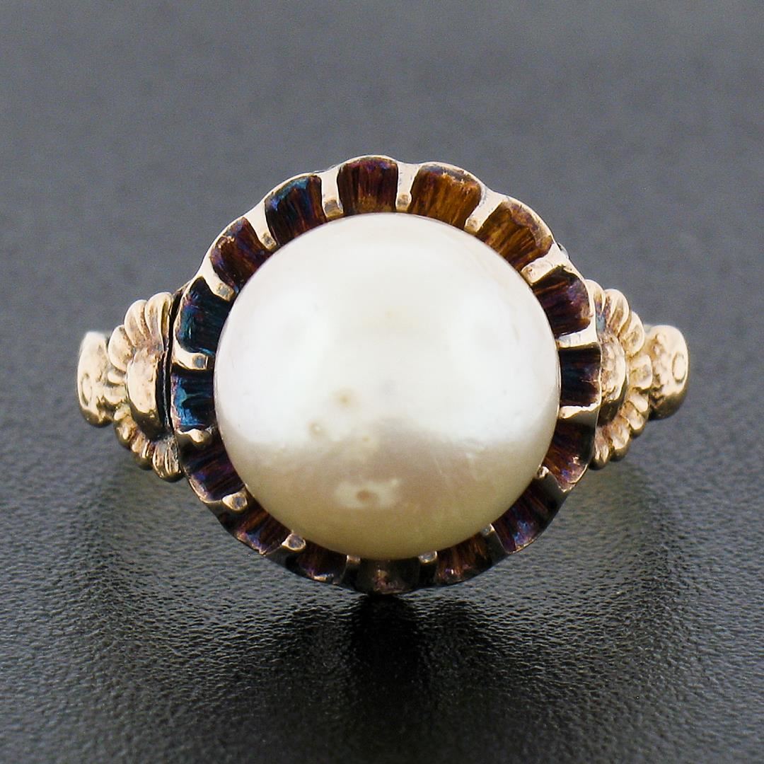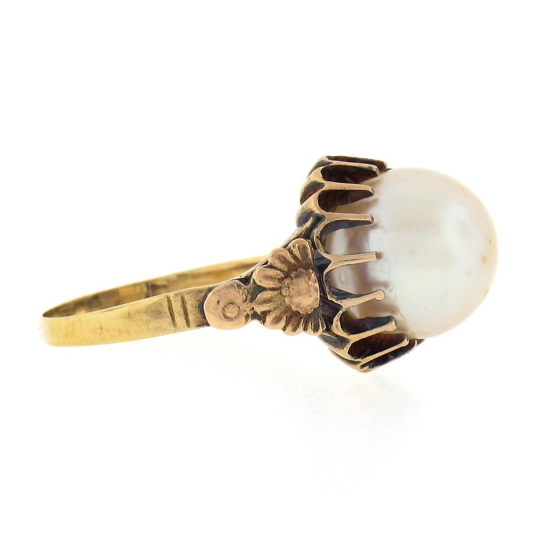An antique solid 18k yellow gold ring, with 1 GIA graded round shape cultured pearl (9.46mm). The ring is size 5.5, weighs a total of 3.71 grams, and measures 12.25mm wide. Comes with all original relevant certifications.