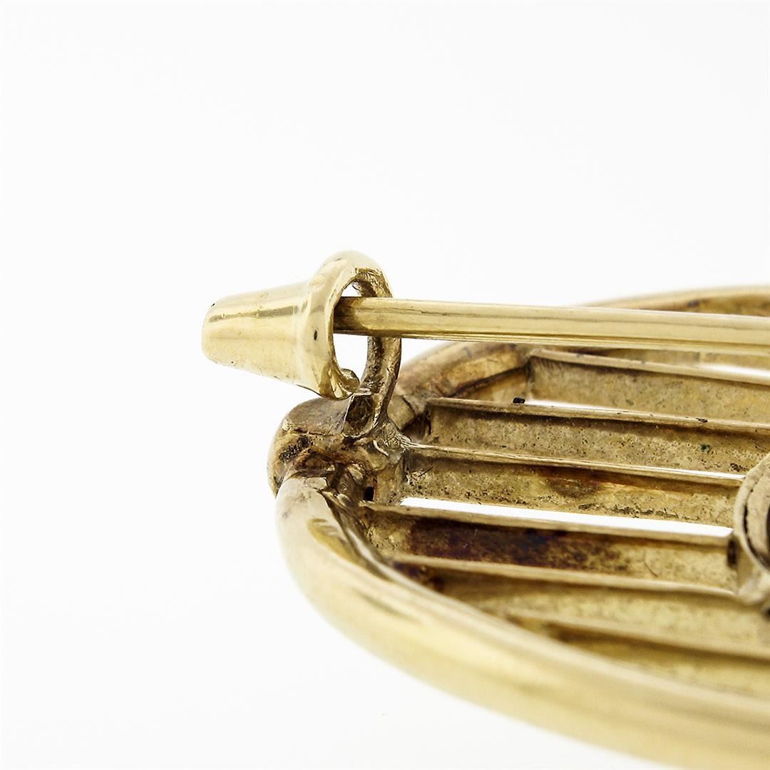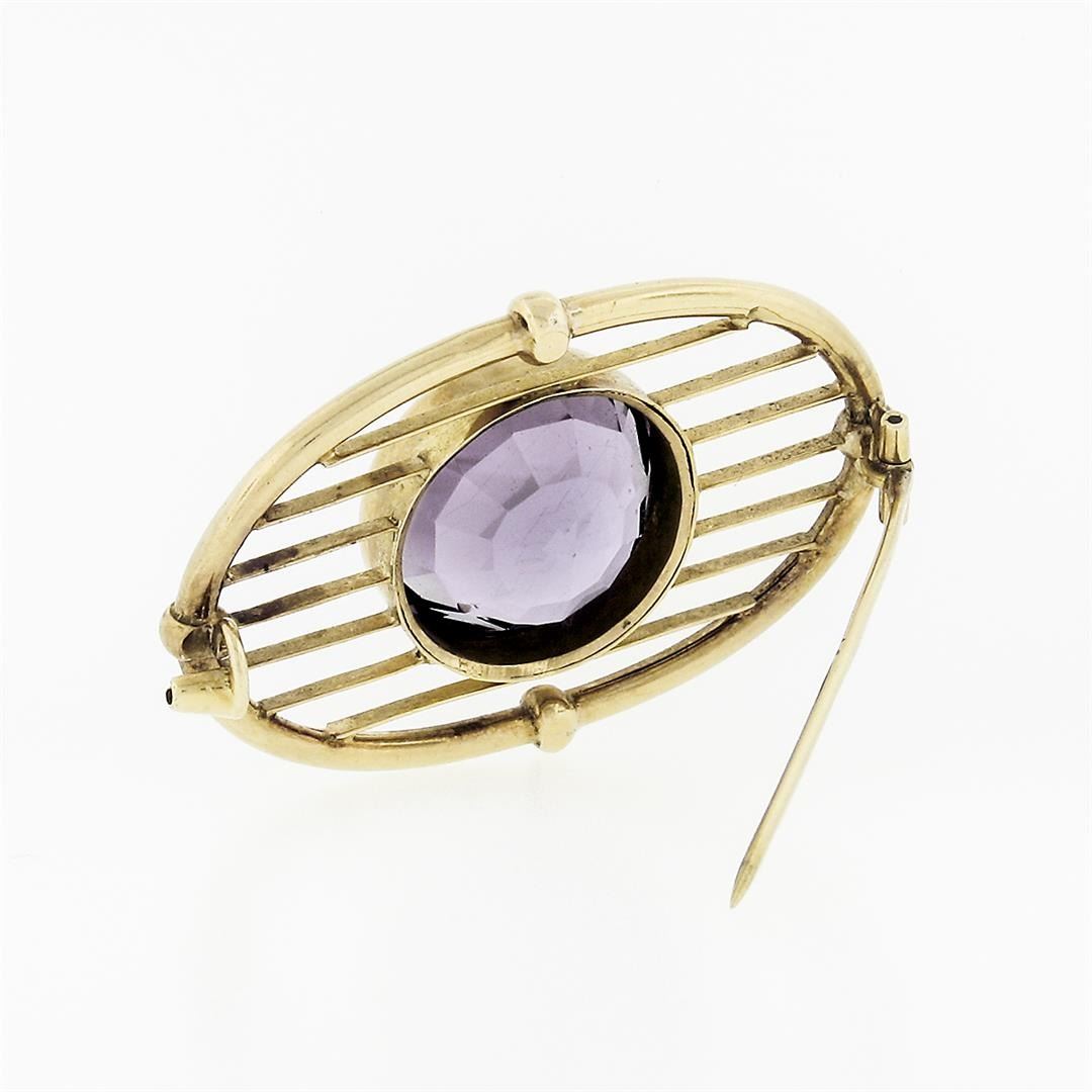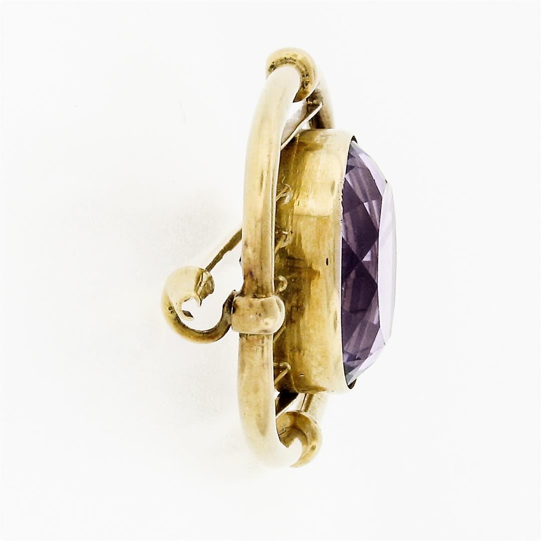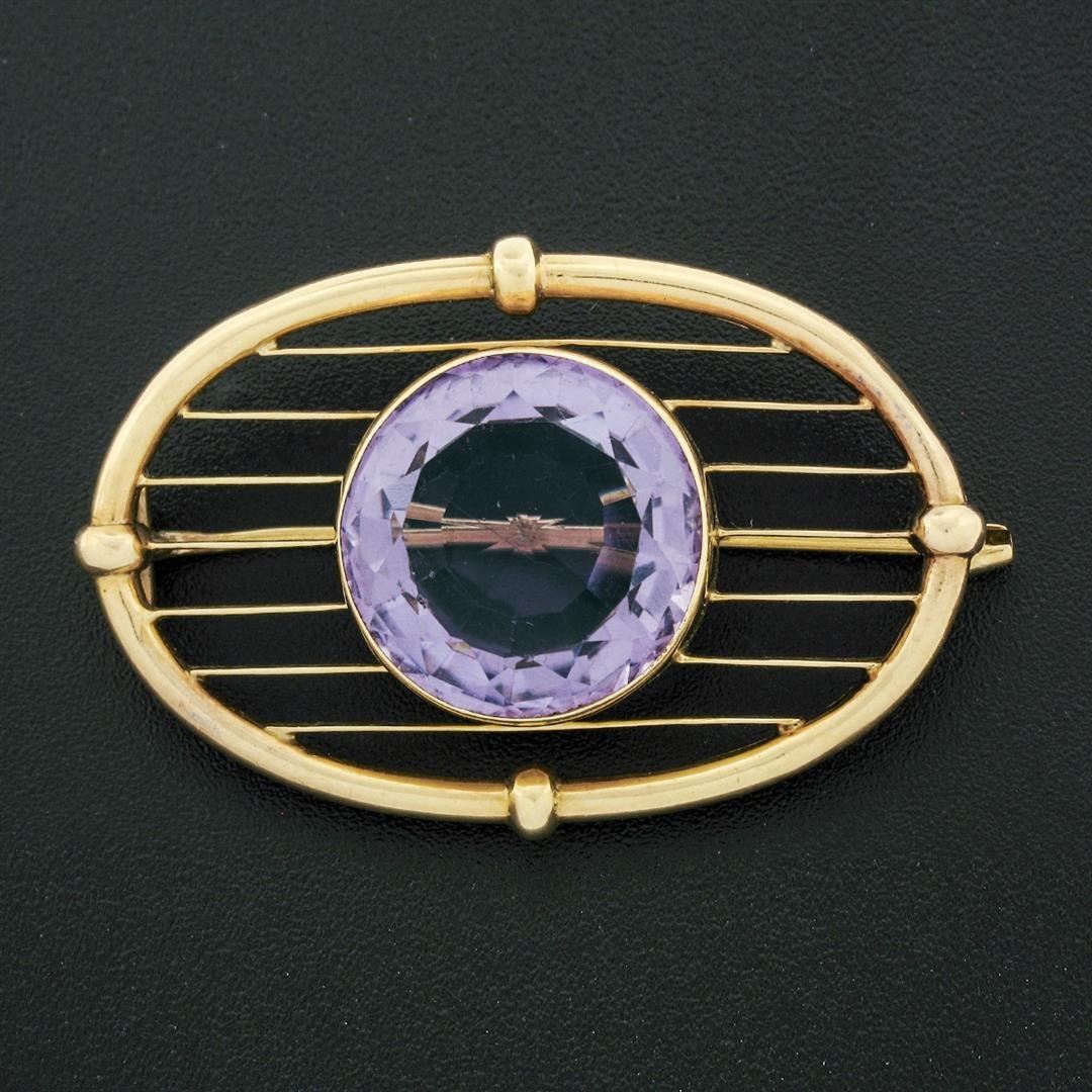A Victorian solid 18k yellow gold pin brooch, with 1 round faceted cut natural amethyst (17.3mm ; 15.28ct). Measures 30.3x45.7mm and weighs a total of 12.40 grams.