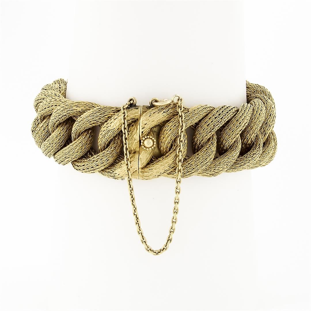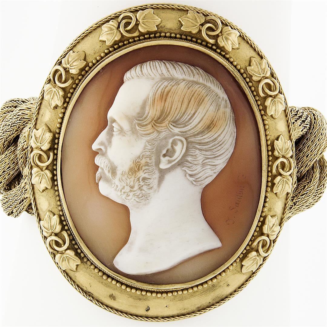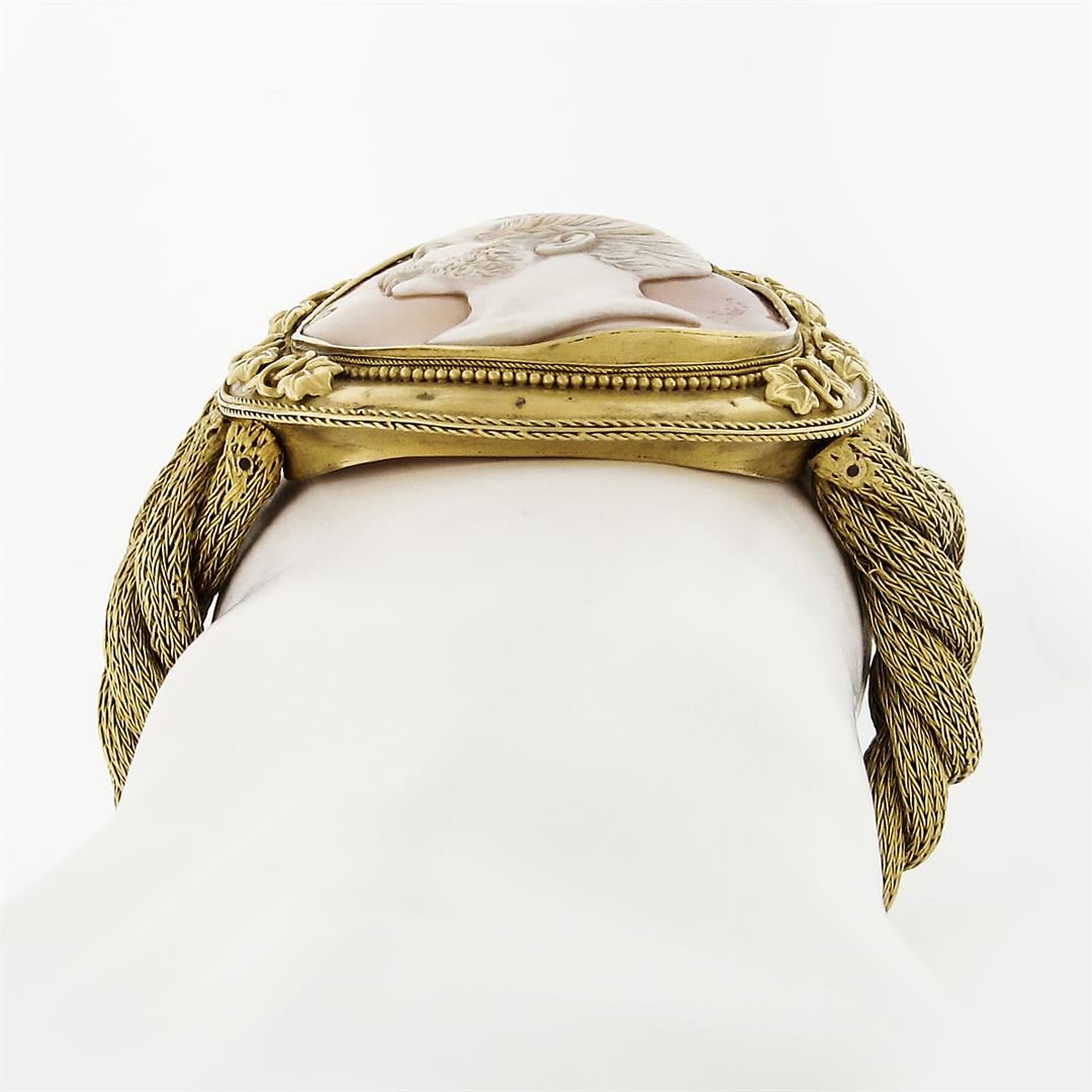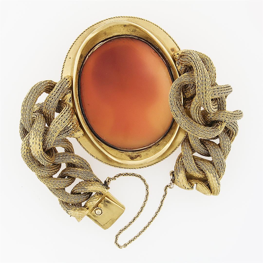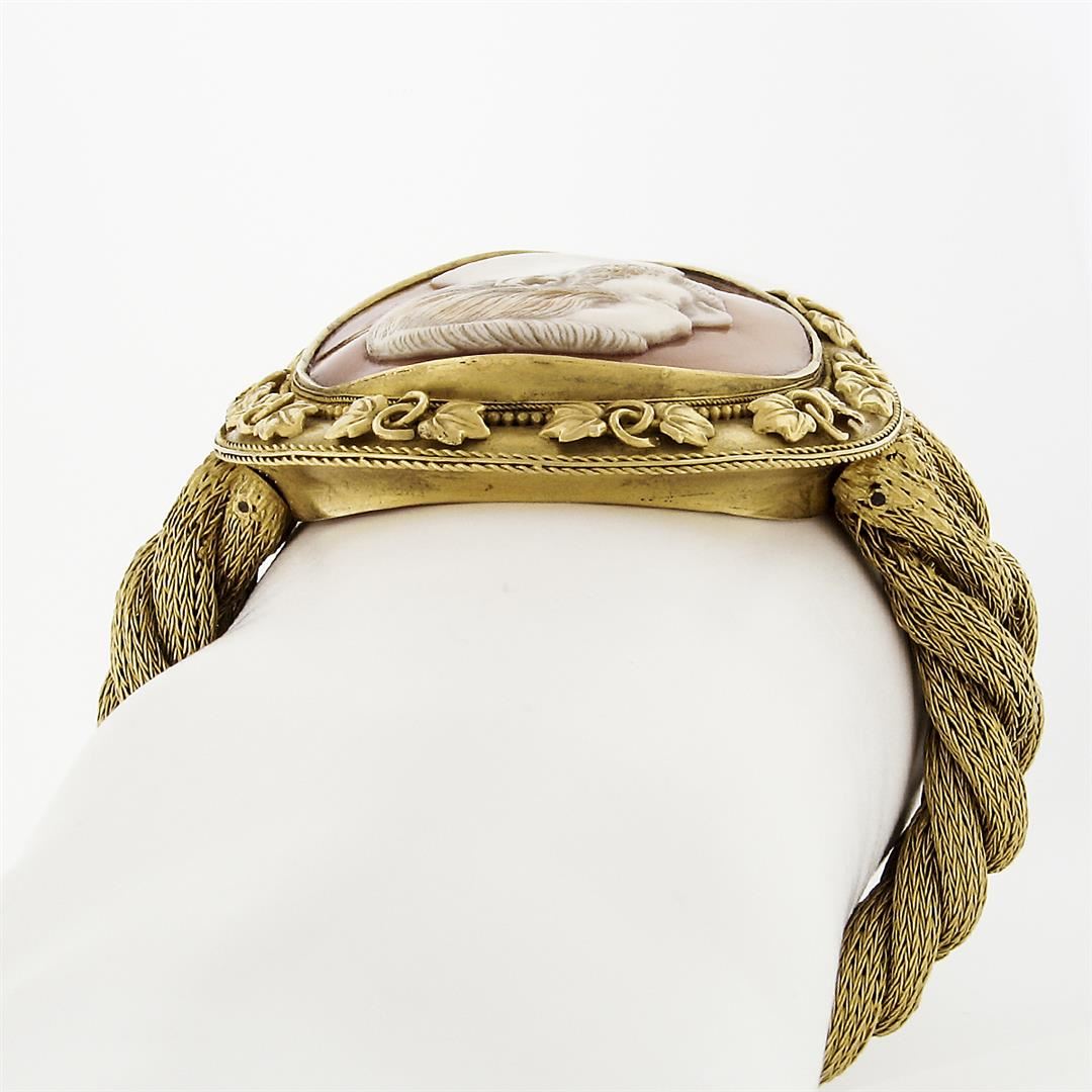 An antique solid 21k yellow gold mesh link statement bracelet, with 1 oval shape carved cameo shell (43.4x36.8mm). It weighs a total of 83.69 grams, measures 50.6mm wide, and measures 6.5 inches in length.