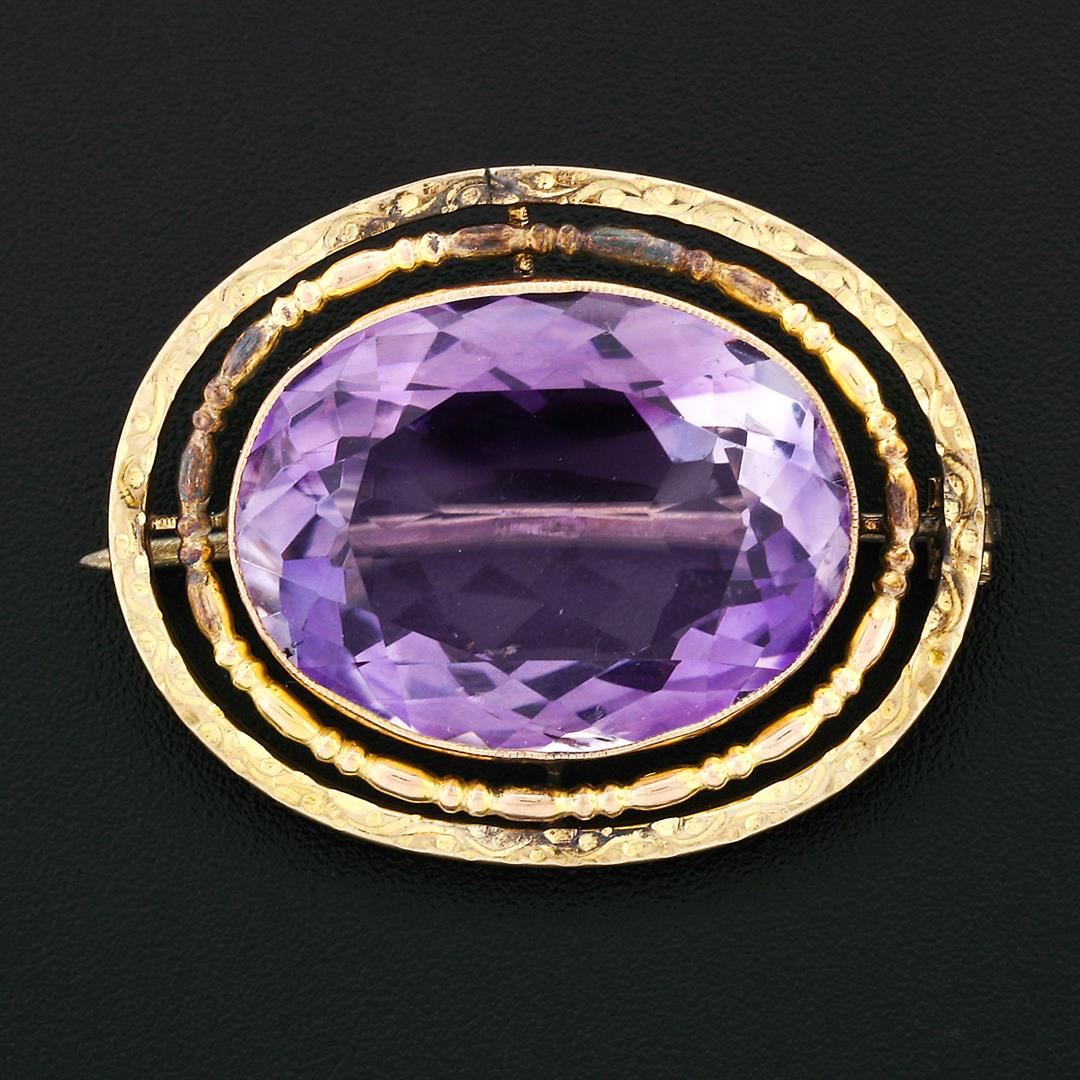 A Victorian era solid 9k yellow gold brooch, with 1 oval faceted cut natural amethyst (22.5x17.5mm - 21.5ct). Measures 26.9x33.5mm and weighs a total of 9.16 grams.
