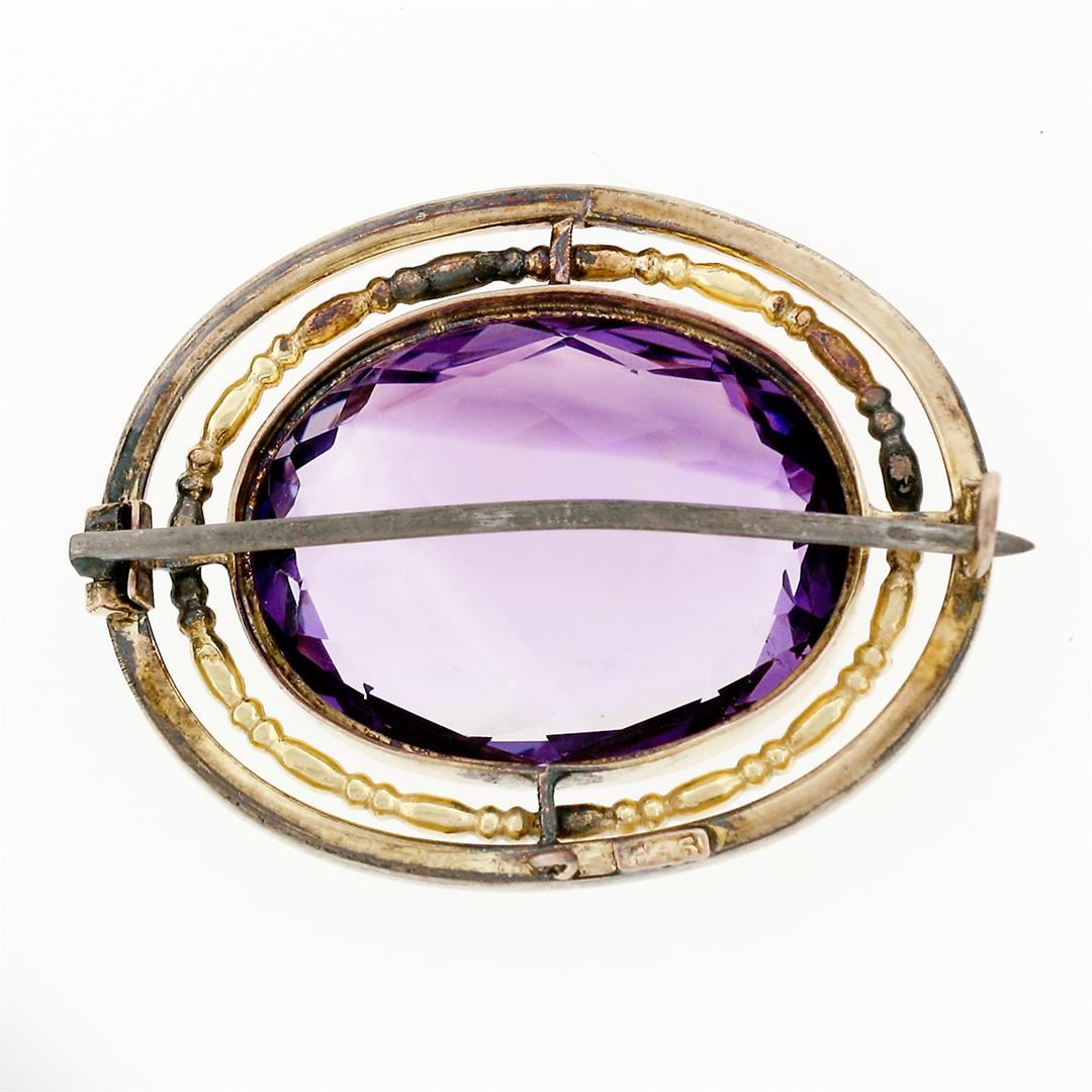 A Victorian era solid 9k yellow gold brooch, with 1 oval faceted cut natural amethyst (22.5x17.5mm - 21.5ct). Measures 26.9x33.5mm and weighs a total of 9.16 grams.