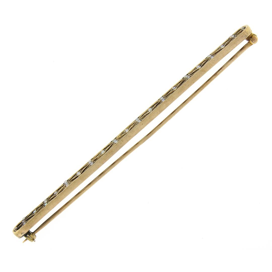 An antique solid 9k yellow gold bar brooch, with 41 round shape cultured seed pearls. Measures 85.6x7.4mm and weighs a total of 7.92 grams.