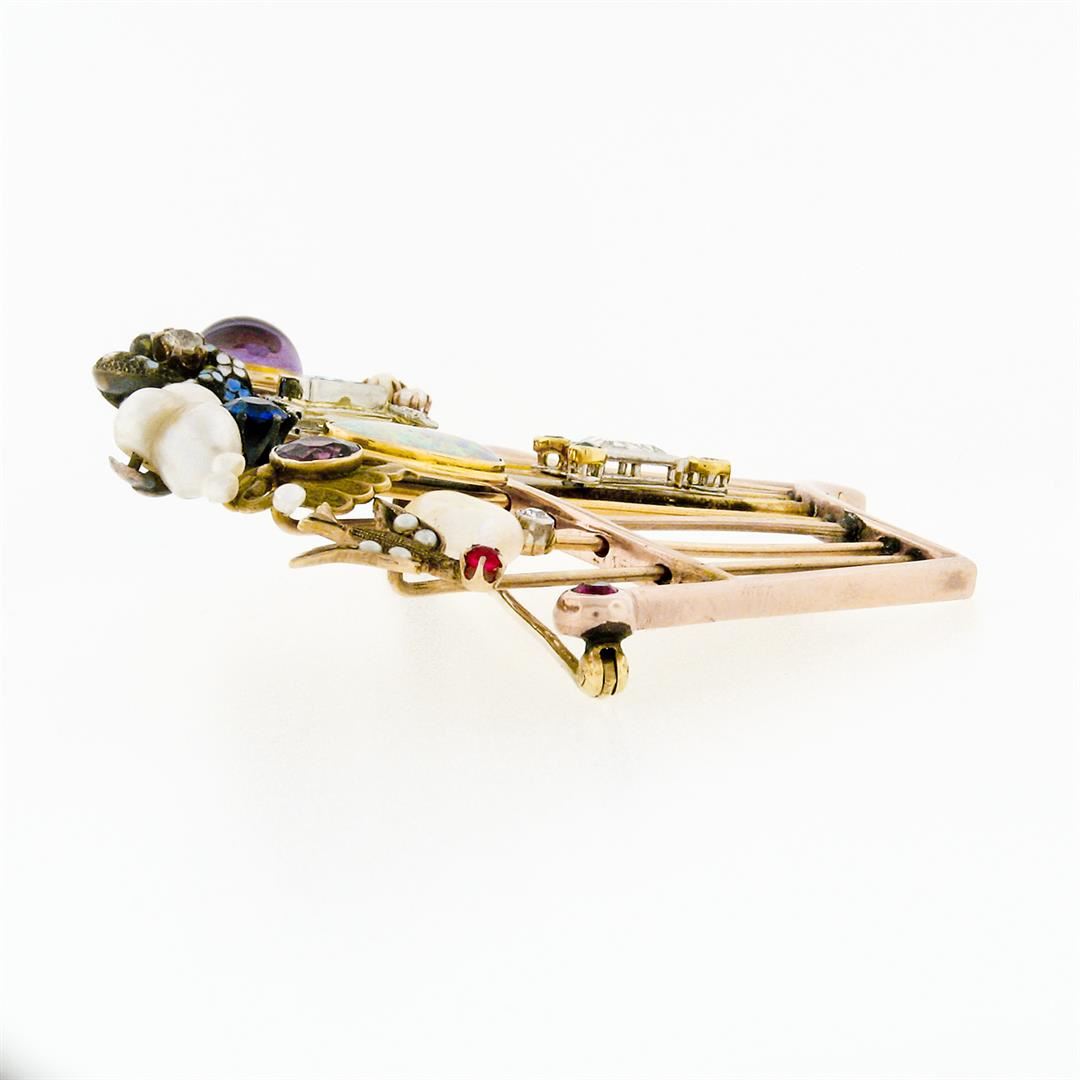 An antique 14k yellow, rose and white gold with silver crown brooch, with 3 round cut red stones (2.85 - 2.2mm), 15 round & baroque natural seed pearls (2.65 - 1.55mm), 1 baroque shape cultured pearl ( 7.65x7.15x4.75mm), 1 tripple off round shape natural cluster pearl (7.80x11.35x6.50mm), 1 old mine cut natural sapphire (4.50mm - 0.46ct), 2 old mine cut and round cabochon cut natural amethyst (5.70mm & 9.20mm - 0.60ct & 3.27ct), 1 oval cabohon cut naural opal (12.4x6.2mm), 6 old mine cut and oval cut natural emeralds (1.65mm & 2.50x1.65mm ), 1 old mine cut natural diamond (Faint Yellow Color - SI1 ; 0.09ct ), 1 old mine cut natural diamond (G - I1 ; 0.05ct), 1 round rose cut natural diamond (G - VS2 ; 0.04ct ), 1 old european cut natural diamond (G - VS2 ; 0.05ct), 1 triangular step cut natural diamond (H- VS2 ; 0.60ct), and 1 old custom triangular cut natural aquamarine (7.55x9.15mm). Measures 58.75x69.55mm and weighs a total of 23.88 grams.