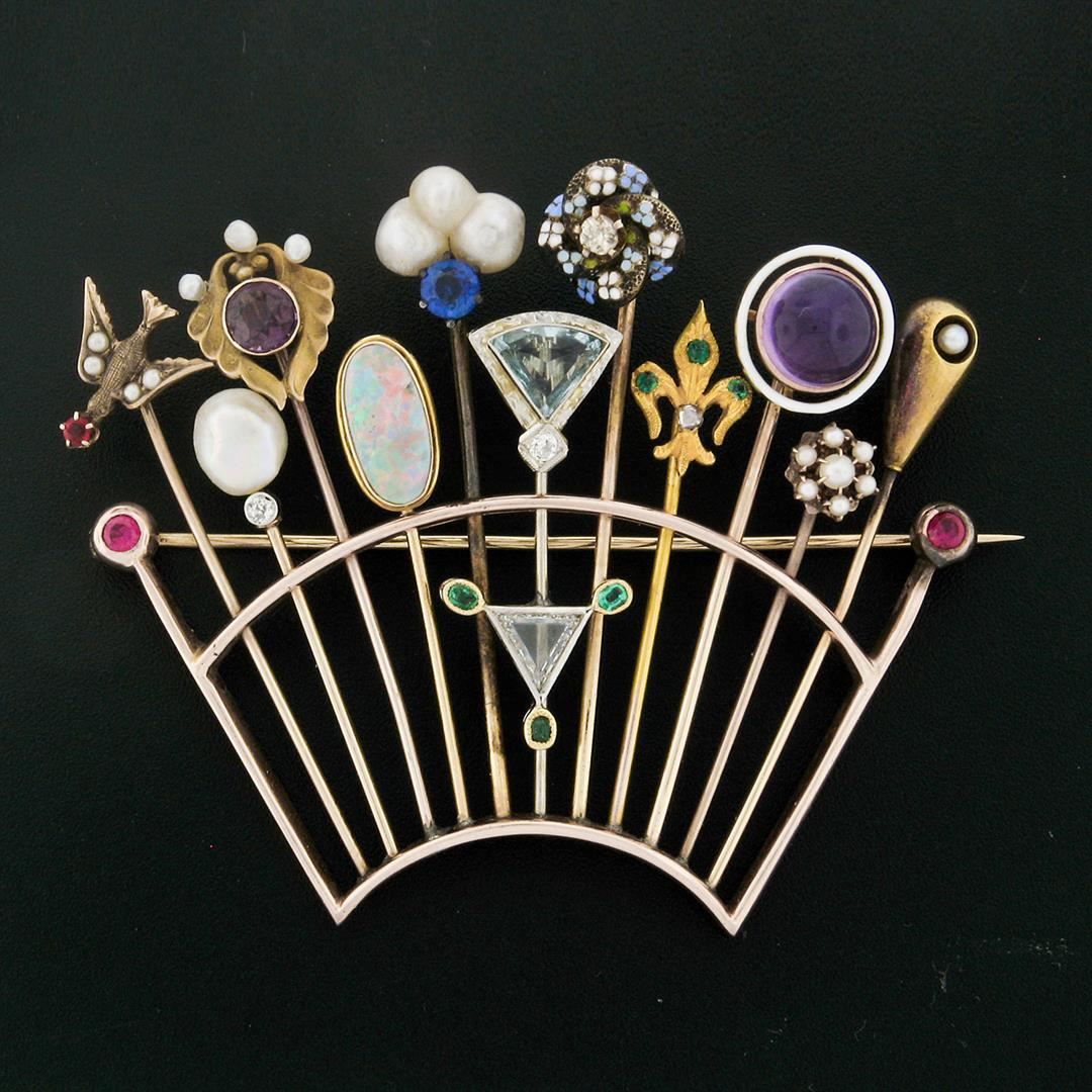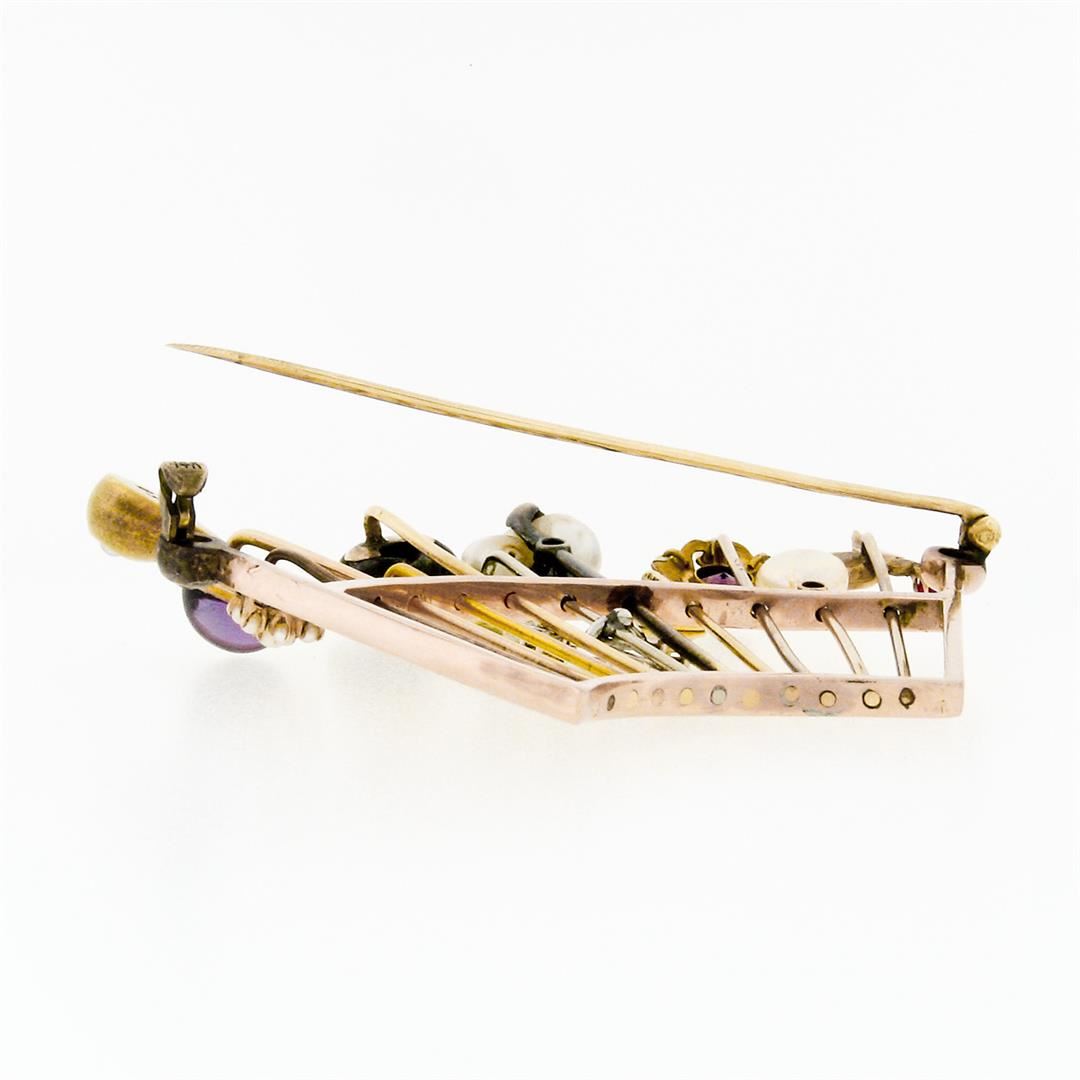 An antique 14k yellow, rose and white gold with silver crown brooch, with 3 round cut red stones (2.85 - 2.2mm), 15 round & baroque natural seed pearls (2.65 - 1.55mm), 1 baroque shape cultured pearl ( 7.65x7.15x4.75mm), 1 tripple off round shape natural cluster pearl (7.80x11.35x6.50mm), 1 old mine cut natural sapphire (4.50mm - 0.46ct), 2 old mine cut and round cabochon cut natural amethyst (5.70mm & 9.20mm - 0.60ct & 3.27ct), 1 oval cabohon cut naural opal (12.4x6.2mm), 6 old mine cut and oval cut natural emeralds (1.65mm & 2.50x1.65mm ), 1 old mine cut natural diamond (Faint Yellow Color - SI1 ; 0.09ct ), 1 old mine cut natural diamond (G - I1 ; 0.05ct), 1 round rose cut natural diamond (G - VS2 ; 0.04ct ), 1 old european cut natural diamond (G - VS2 ; 0.05ct), 1 triangular step cut natural diamond (H- VS2 ; 0.60ct), and 1 old custom triangular cut natural aquamarine (7.55x9.15mm). Measures 58.75x69.55mm and weighs a total of 23.88 grams.