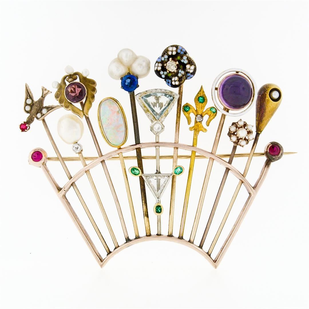 An antique 14k yellow, rose and white gold with silver crown brooch, with 3 round cut red stones (2.85 - 2.2mm), 15 round & baroque natural seed pearls (2.65 - 1.55mm), 1 baroque shape cultured pearl ( 7.65x7.15x4.75mm), 1 tripple off round shape natural cluster pearl (7.80x11.35x6.50mm), 1 old mine cut natural sapphire (4.50mm - 0.46ct), 2 old mine cut and round cabochon cut natural amethyst (5.70mm & 9.20mm - 0.60ct & 3.27ct), 1 oval cabohon cut naural opal (12.4x6.2mm), 6 old mine cut and oval cut natural emeralds (1.65mm & 2.50x1.65mm ), 1 old mine cut natural diamond (Faint Yellow Color - SI1 ; 0.09ct ), 1 old mine cut natural diamond (G - I1 ; 0.05ct), 1 round rose cut natural diamond (G - VS2 ; 0.04ct ), 1 old european cut natural diamond (G - VS2 ; 0.05ct), 1 triangular step cut natural diamond (H- VS2 ; 0.60ct), and 1 old custom triangular cut natural aquamarine (7.55x9.15mm). Measures 58.75x69.55mm and weighs a total of 23.88 grams.